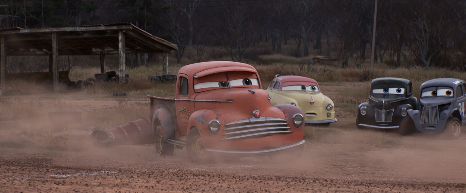 Lightning McQueen and Cruz Ramirez yearn to take part in a down-and-dirty race to reignite the passion Lightning’s lost. Unfortunately, they end up in the midst of a Crazy 8—which is certainly dirty. To achieve the right look and feel for the sequence, filmmakers actually went to a night race that took place on a dirt track. “They were covered in dirt,” says Cone. “It was inspiring.”