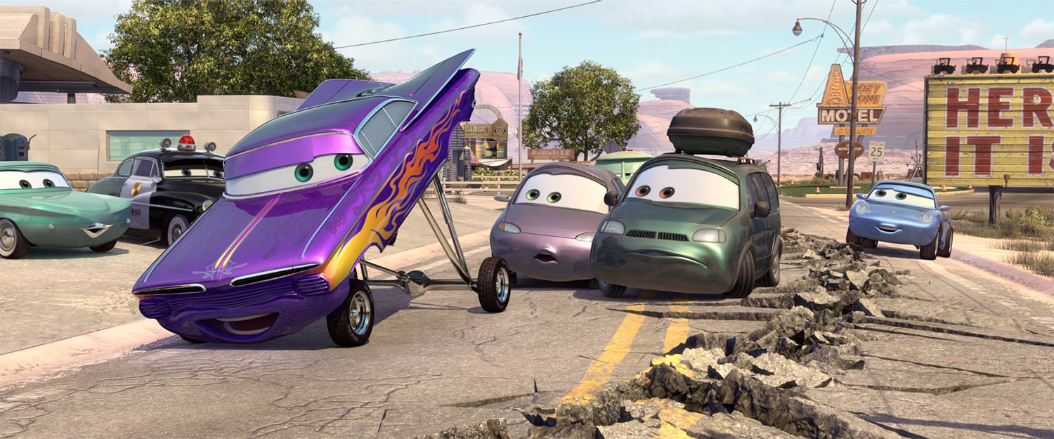 Memorable research trips along Route 66 led the Pixar team to create the town of Radiator Springs in a high desert setting somewhere between Gallup, New Mexico, and Kingman, Arizona, where towns of broken neon, peeling paint, and colorful denizens still exist. “We connected with the people and their towns and we really got it,” Co-Director and Story Supervisor Joe Ranft observed. “We found out that life out on that old highway is never predictable, and that is what makes the journey so much more memorable. We found the heartbeat of the Mother Road.”