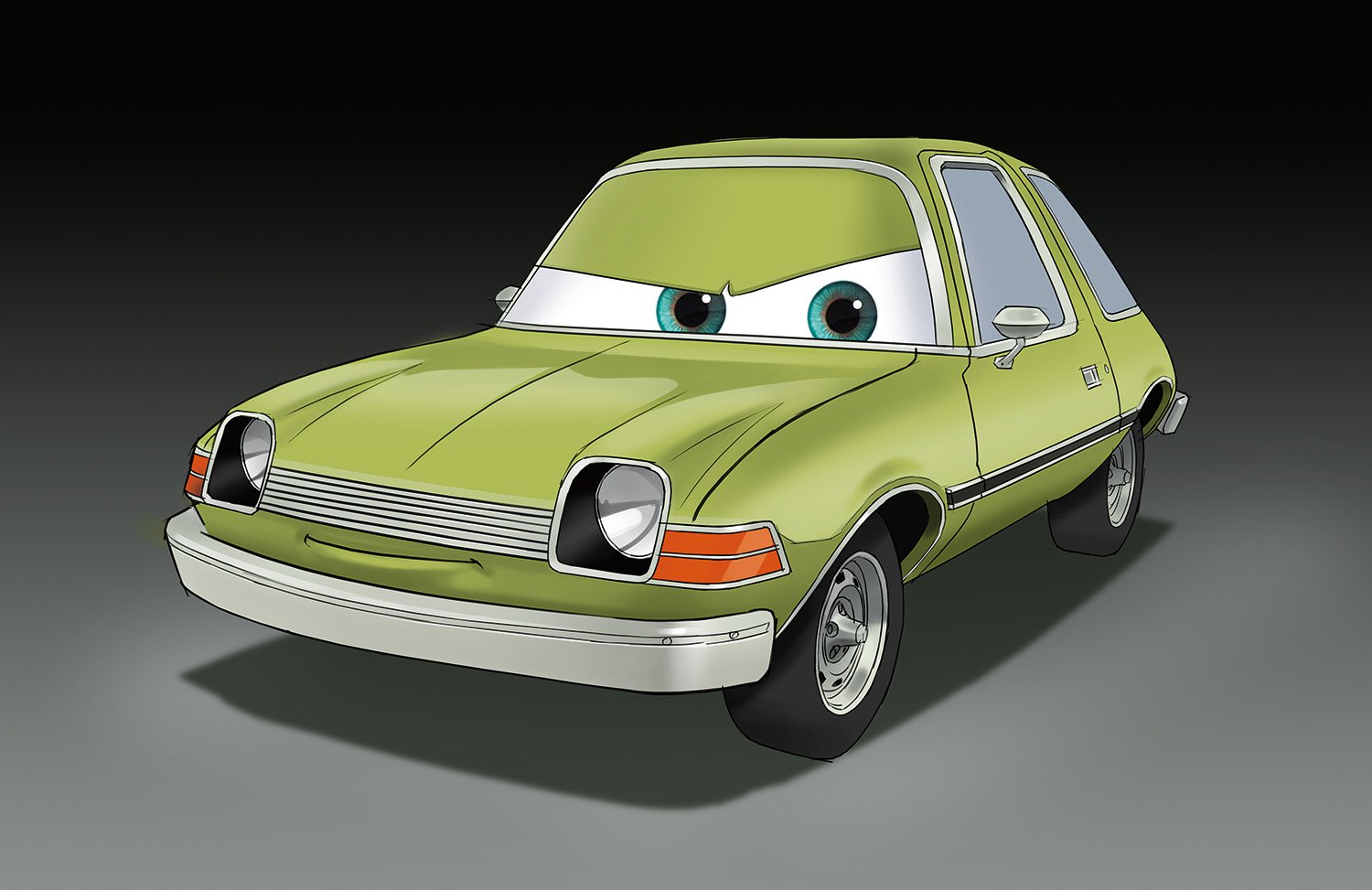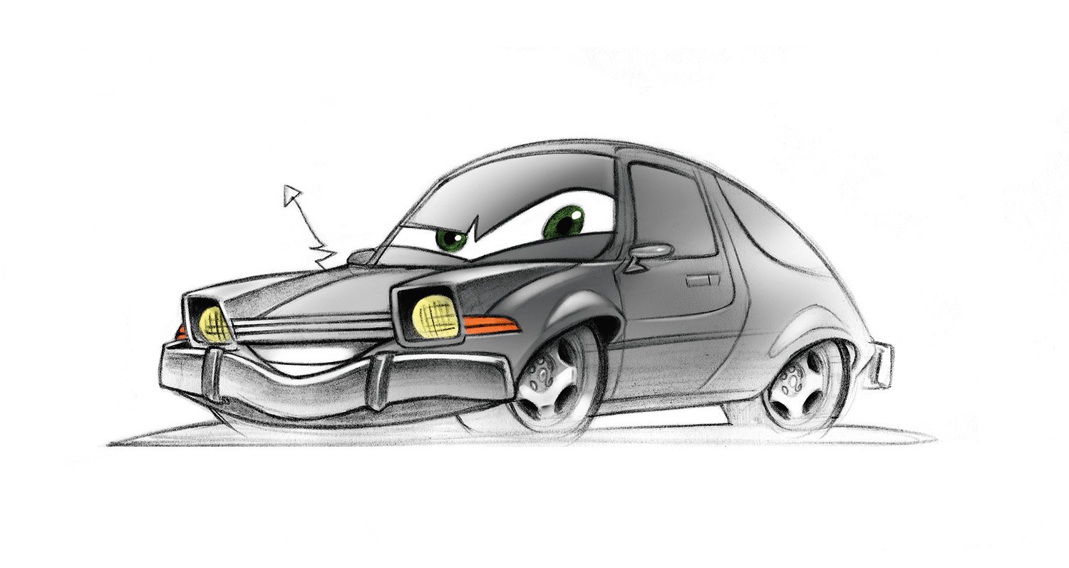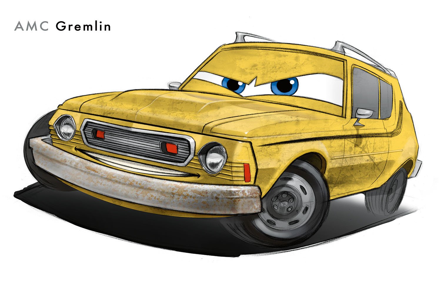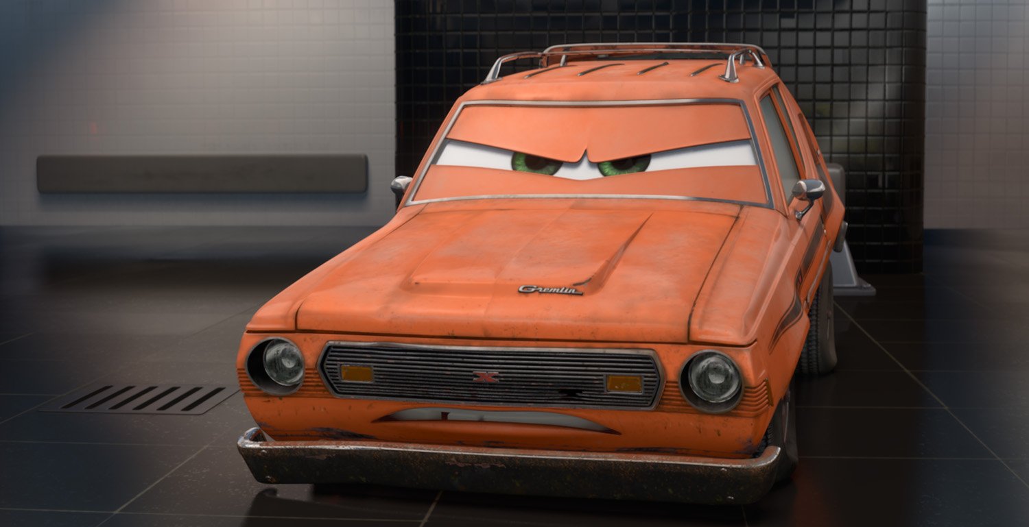 Grem is a dented, rusty orange AMC Gremlin. After years of being dismissed for his design, even being called a “lemon,” Grem has a big chip on his fender that has led him to the underworld of international espionage. As a henchman for a villainous boss, Professor Z, Grem and his partner-in-crime Acer are trying to sabotage the World Grand Prix and the famous race cars competing in it.