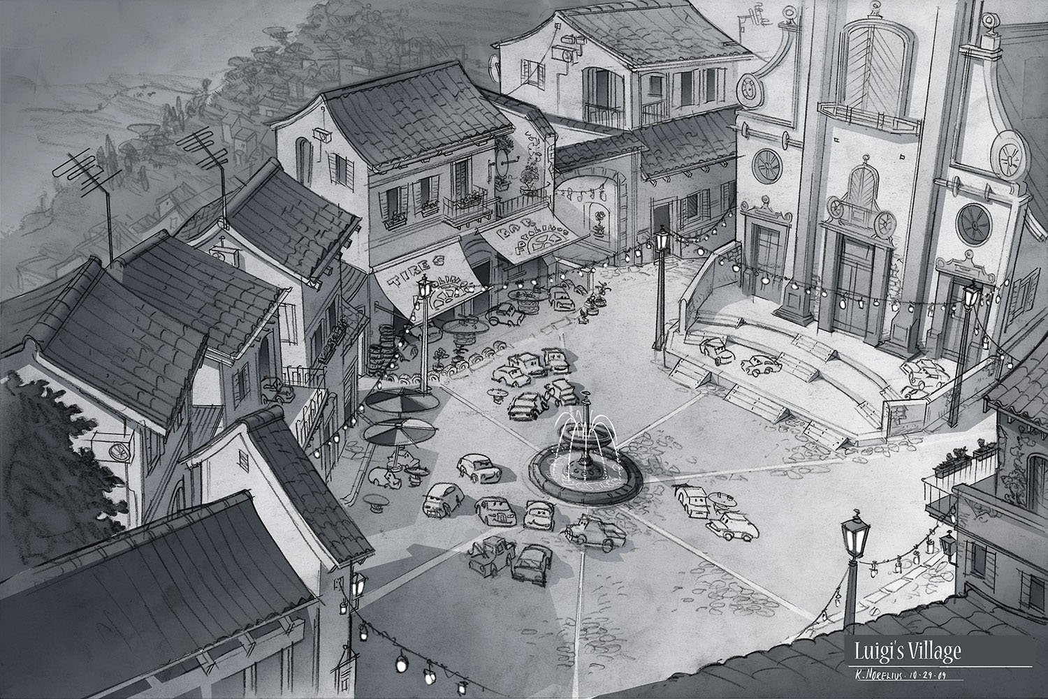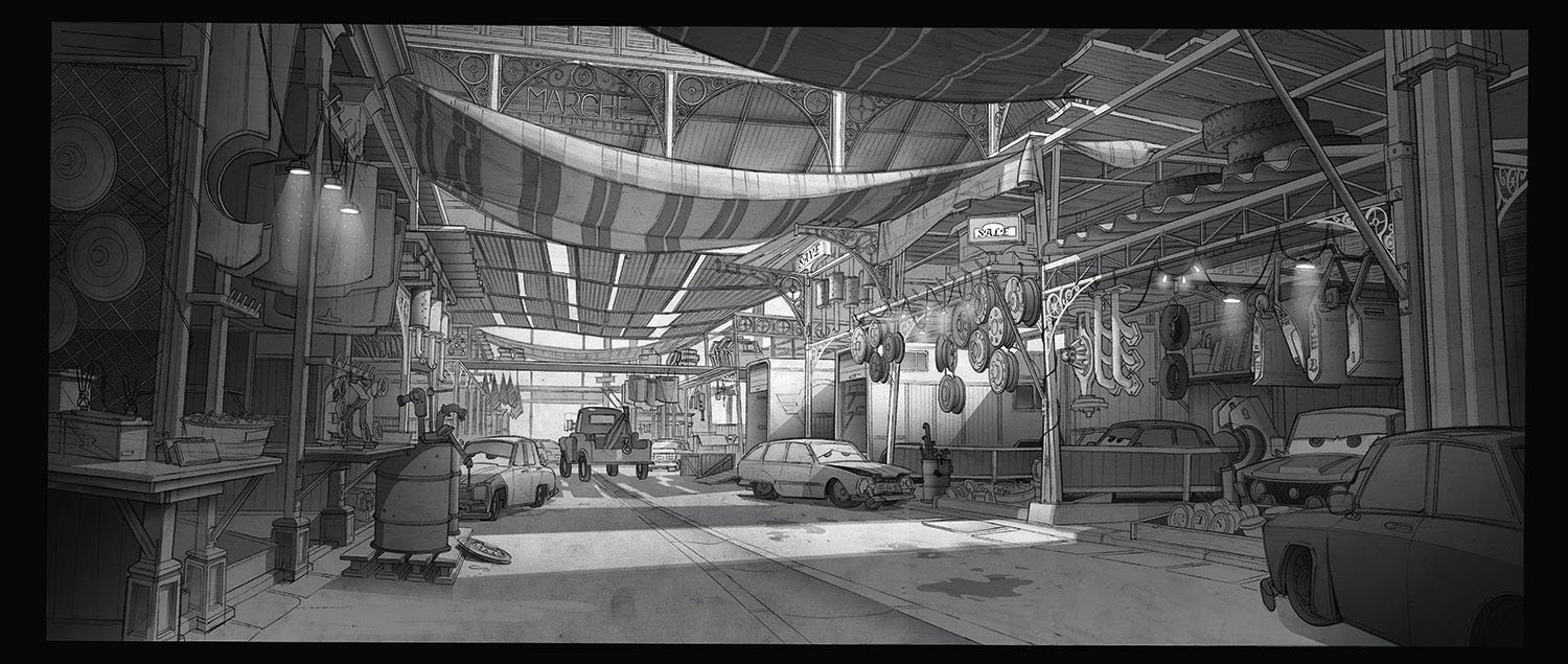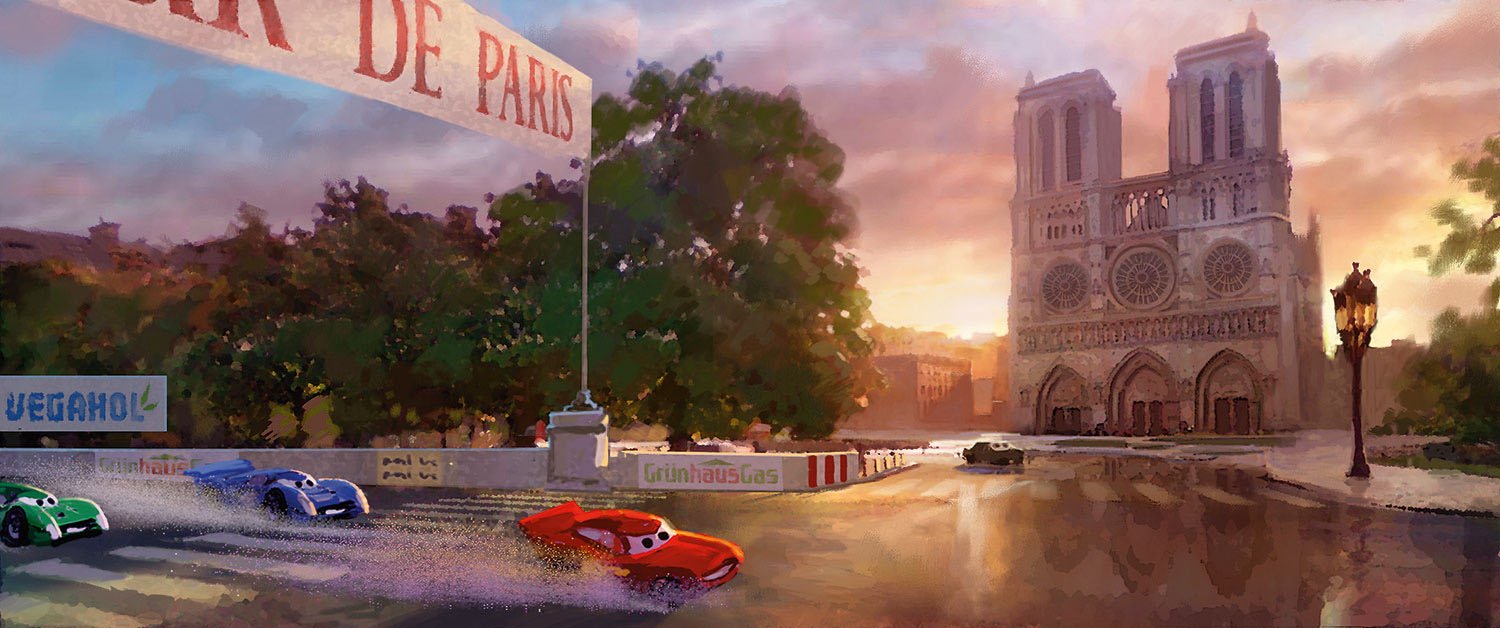 After jettisoning plans for a 24-hour endurance race through Paris, the filmmakers gave the City of Light a more mysterious role. Inspired by classic action-thriller films, they used Paris for a chase veering away from the postcard imagery of the usual lush travelogue backdrop. The Pixar team found inspiration in vintage photos of Paris’s old central market, Les Halles, to create an unexpected setting for the black market storyline.