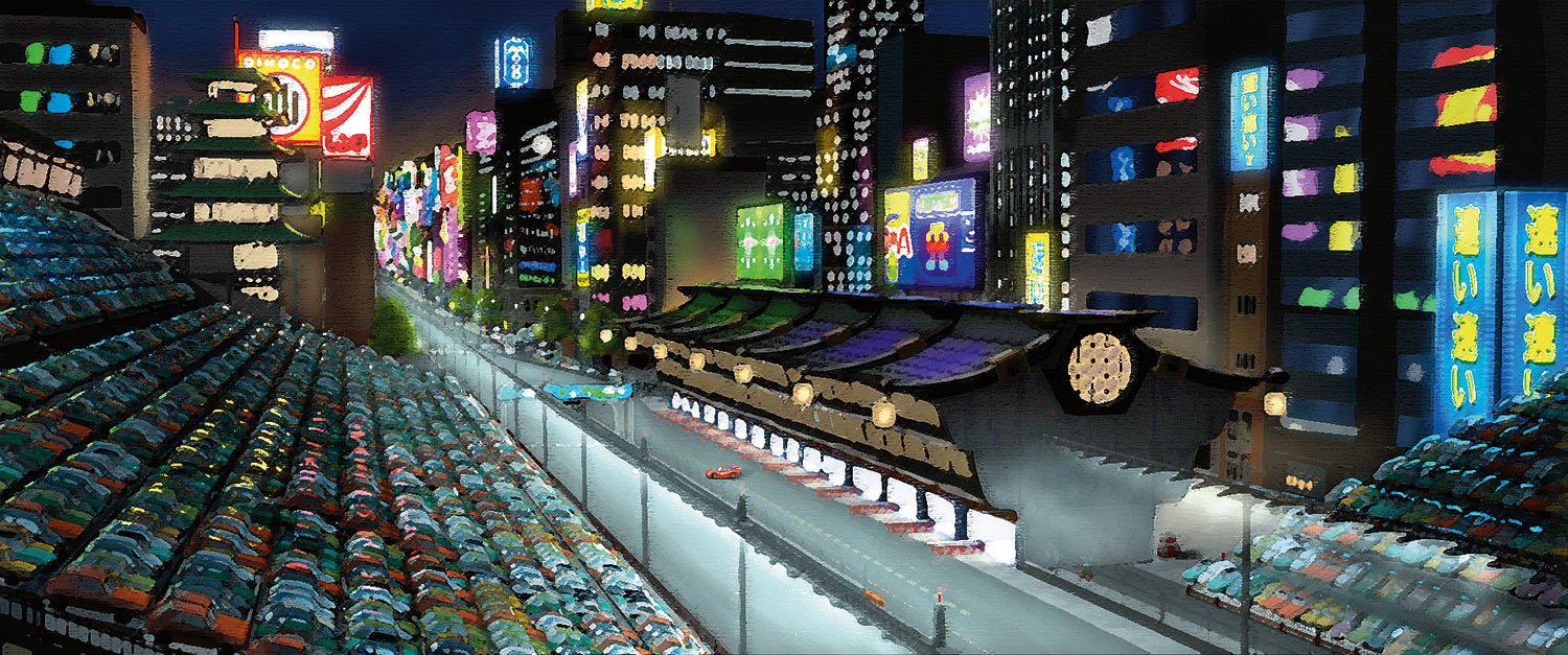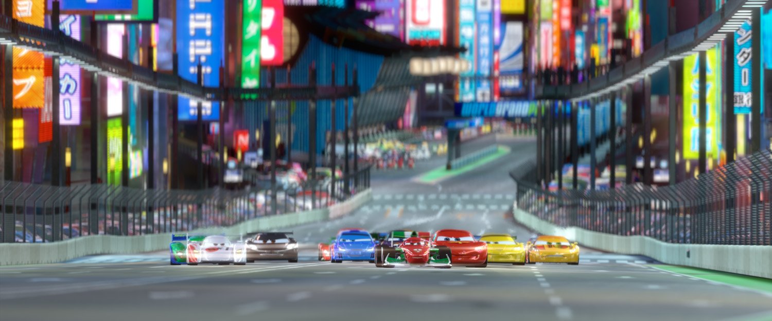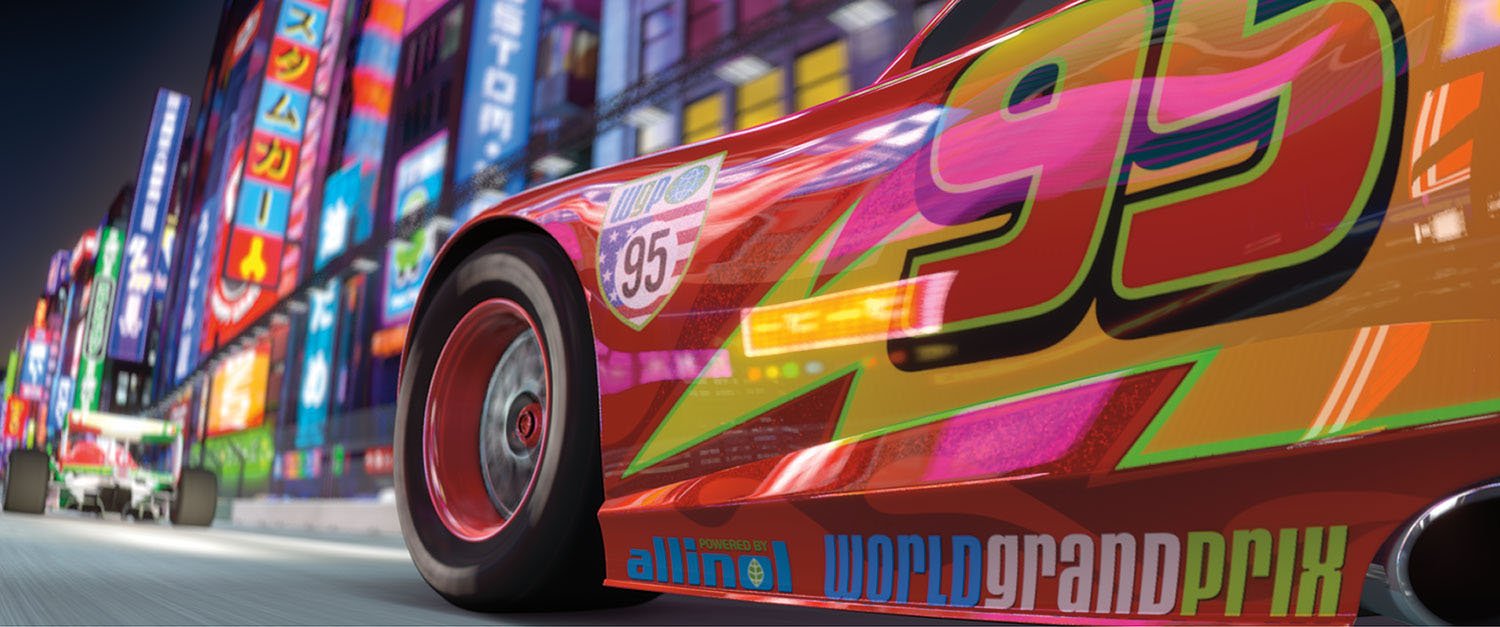Setting the tone for the film’s fictional World Grand Prix, the opening race in Tokyo took inspiration from Singapore’s Formula One night race. “Having the Tokyo race take place at night let us showcase a really rich and beautiful range of light sources, from glowing lanterns to the amazing neon signs downtown to the chaos of light reflecting on the cars themselves,” said Director of Photography for Lighting, Sharon Calahan.