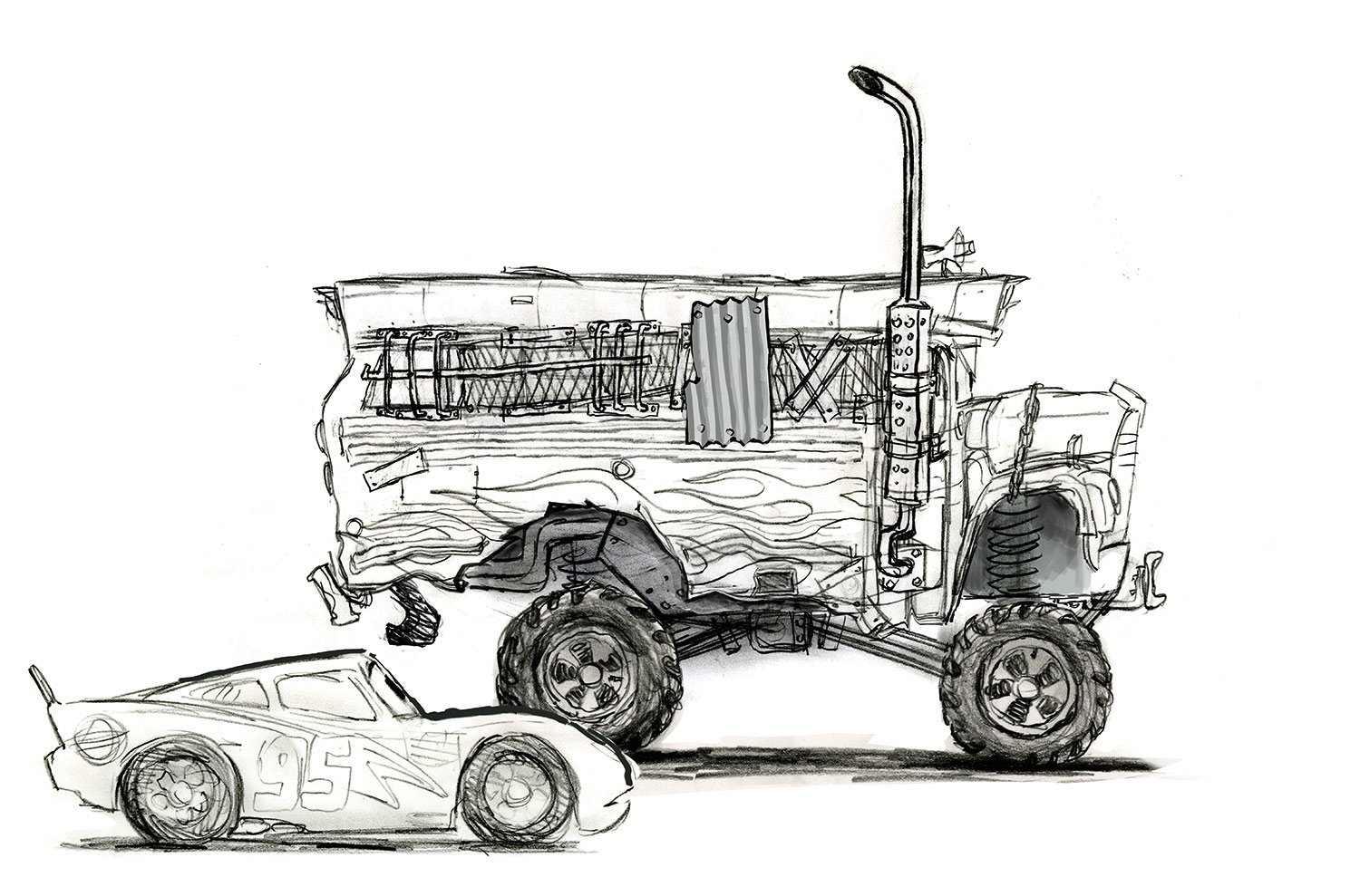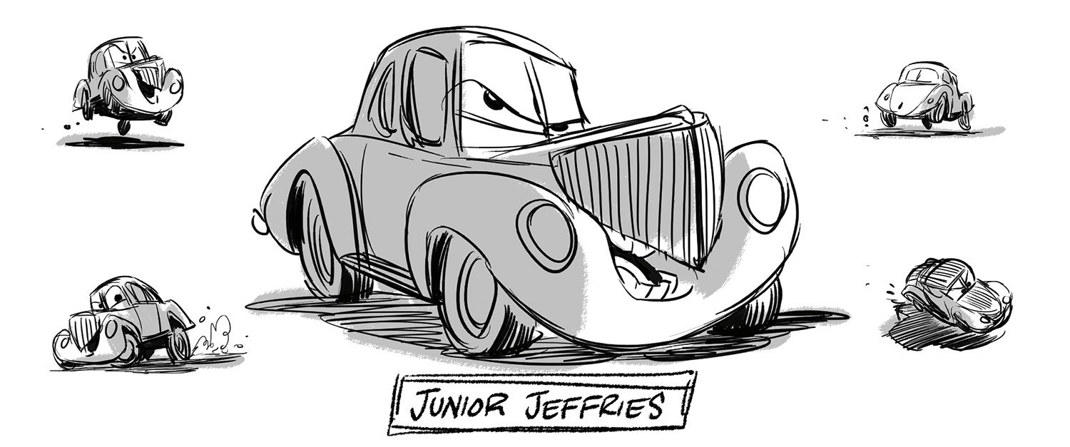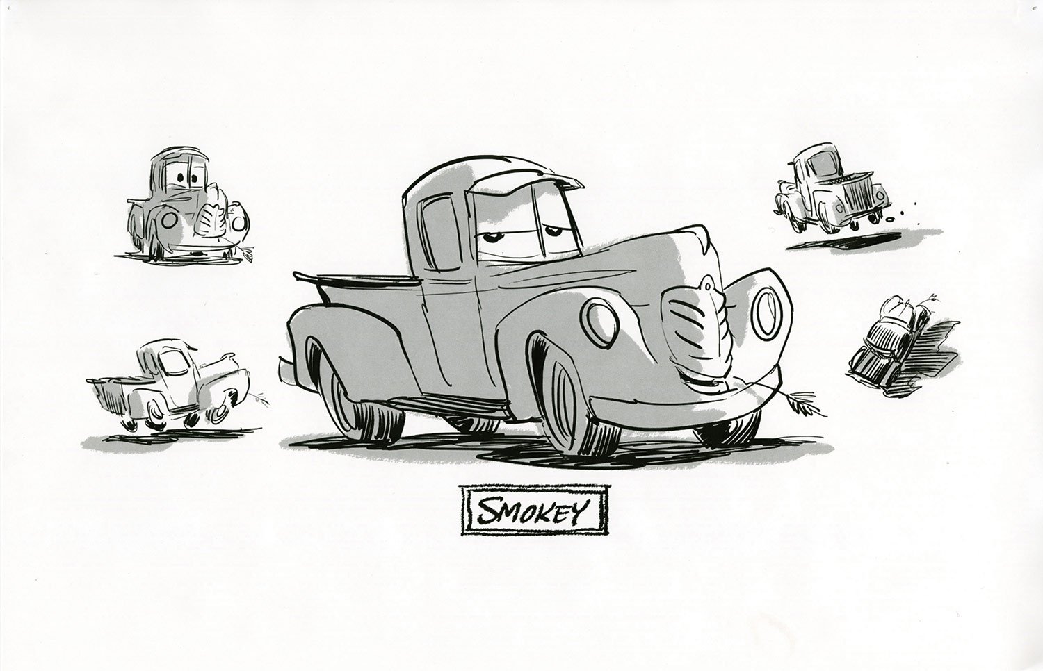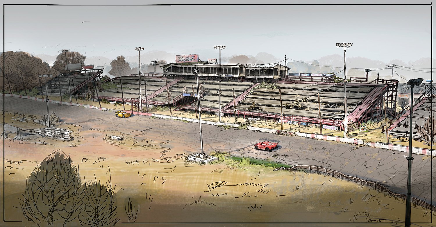 When Lightning McQueen realizes that high-tech training may not be the key to his renewed success, he’s inspired to track down the coach who trained his mentor, Doc Hudson. He finds himself in Thomasville, where former crew chief Smokey runs an old-school garage. “Doc grew up in Thomasville—he actually raced his first race there,” says sets art director Noah Klocek. “We took research trips to the South where NASCAR got its start, spending some time in northern Georgia and South Carolina.”