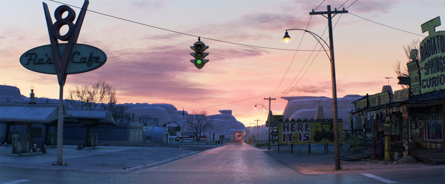Although Lightning McQueen ventures far from home in an effort to rediscover what makes him a great racer, his heart will always be in Radiator Springs. But it’s been a few years since his hometown last saw the big screen. “We had to upgrade it a little,” says production designer Bill Cone. “The rest of the world will have the kind of detail we’re capable of achieving now, so we needed to bring Radiator Springs into the same movie.”