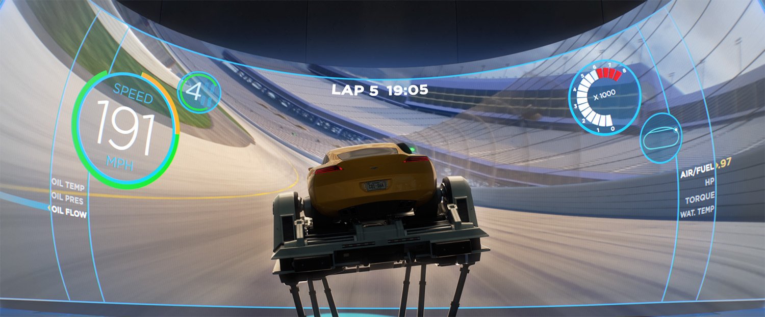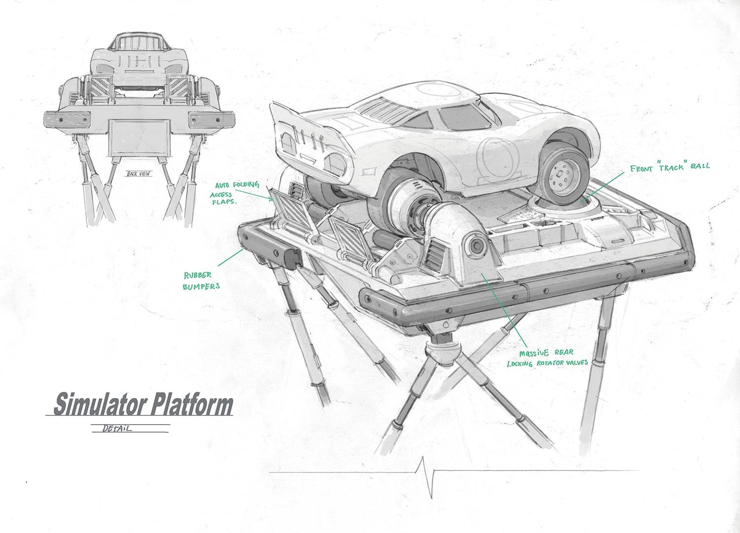 The Rust-eze Training Center is a state-of-the-art facility with high-tech equipment. “We started with the size and shape of an airplane hangar,” says Production Designer Bill Cone. “And we filled it with all of the gadgets and tools a modern racer would want: simulators, treadmills, a yoga room.”