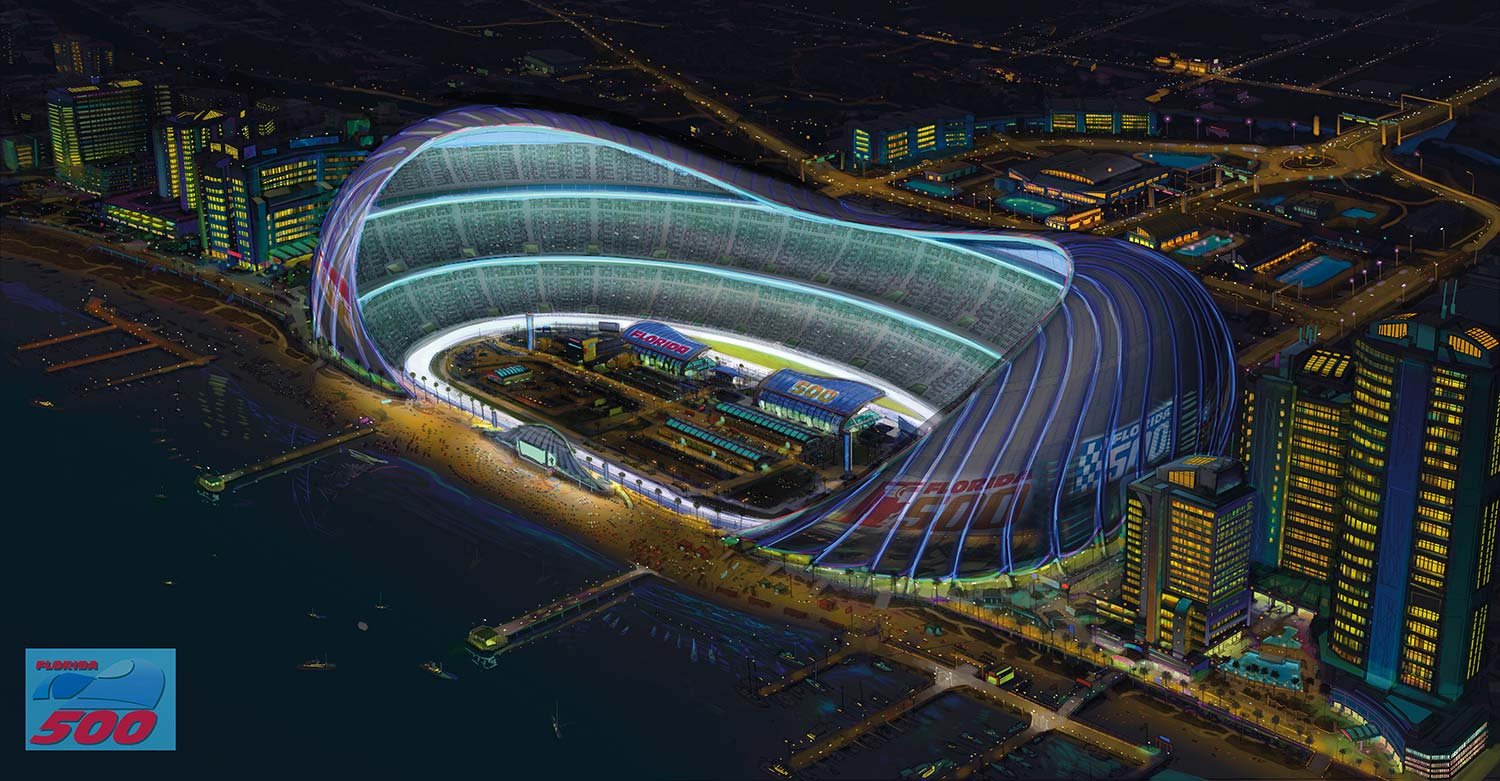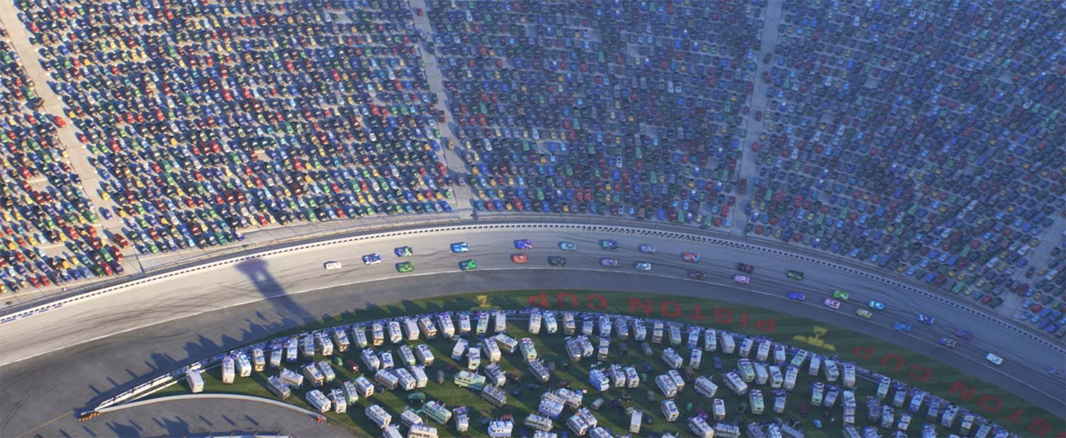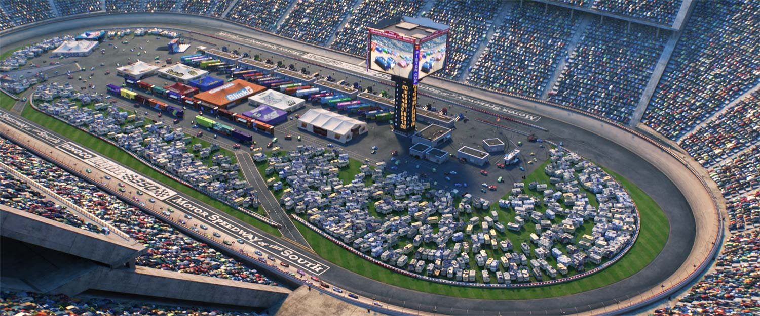 The film features several races across the country—and filmmakers added details to make sure each track had a distinctive personality. But the final race in the film that takes place in Florida was a culmination of Lightning McQueen’s journey—so it had to be special. “We were tasked with creating a racetrack that really embraced modernism,” says sets art director Noah Klocek. “It represents what Jackson Storm and all the rest of the next-gen racers are bringing to the sport.”