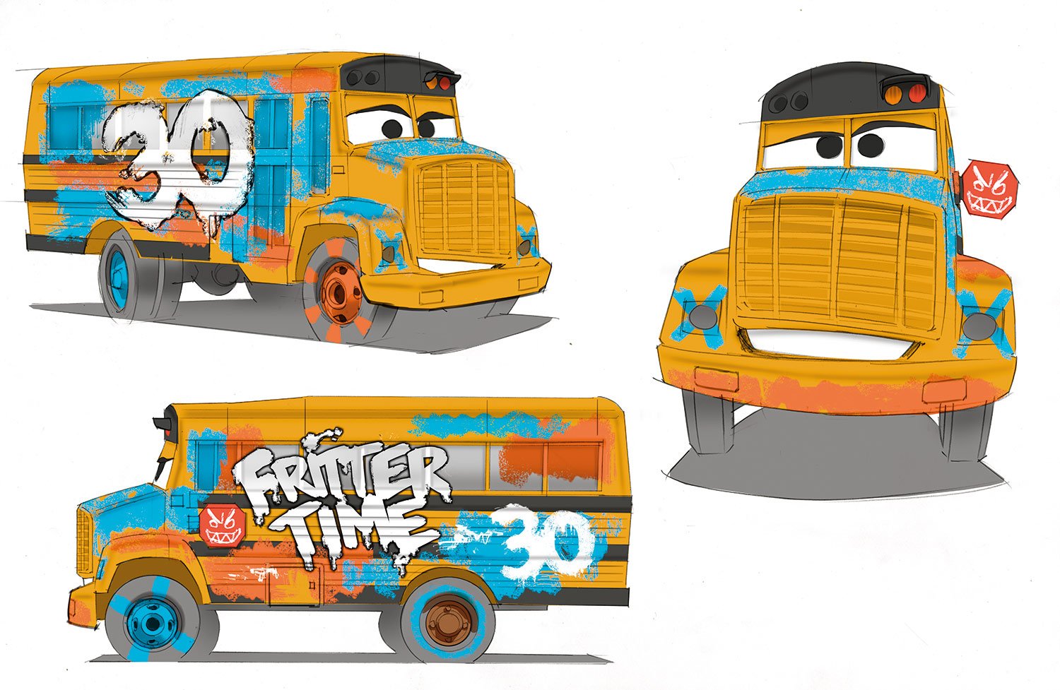 Miss Fritter loves the smash-and-crash life of demolition derby. A local legend at the Thunder Hollow Speedway, Fritter’s formidable school-bus size is intimidating, but it’s her smokestacks of doom, razor-sharp stop sign and crazy collection of her victims’ license plates that usually steer her opponents in the other direction.