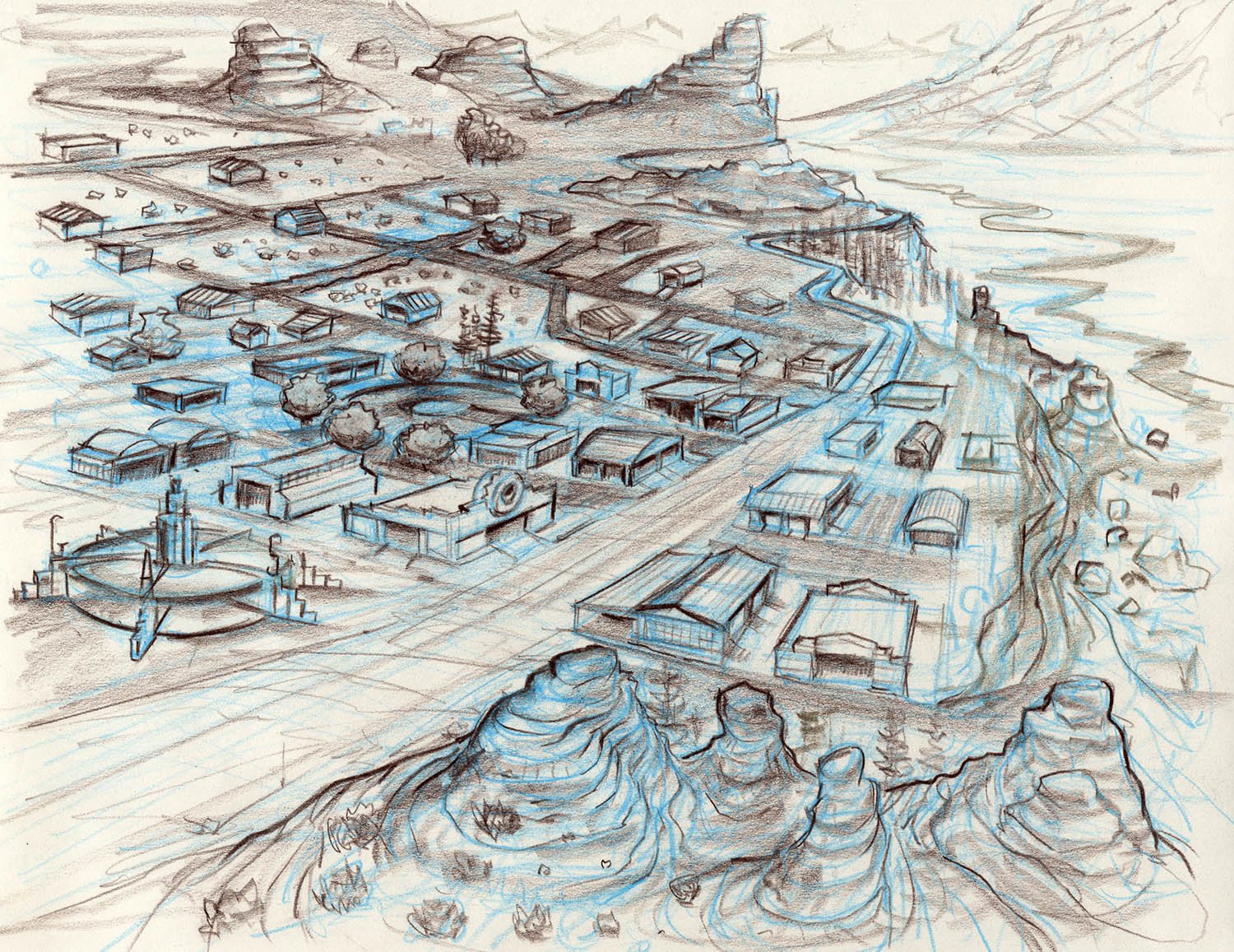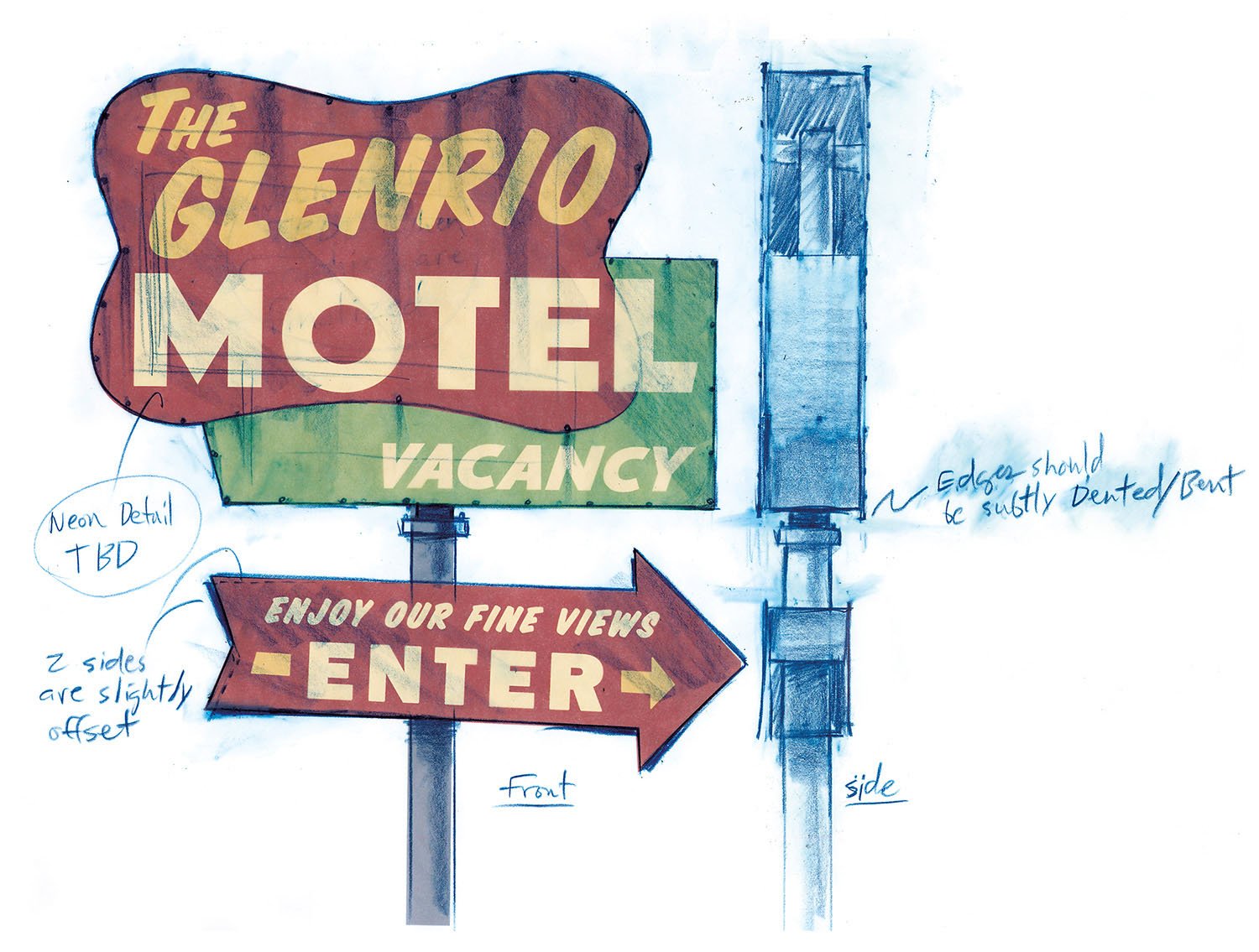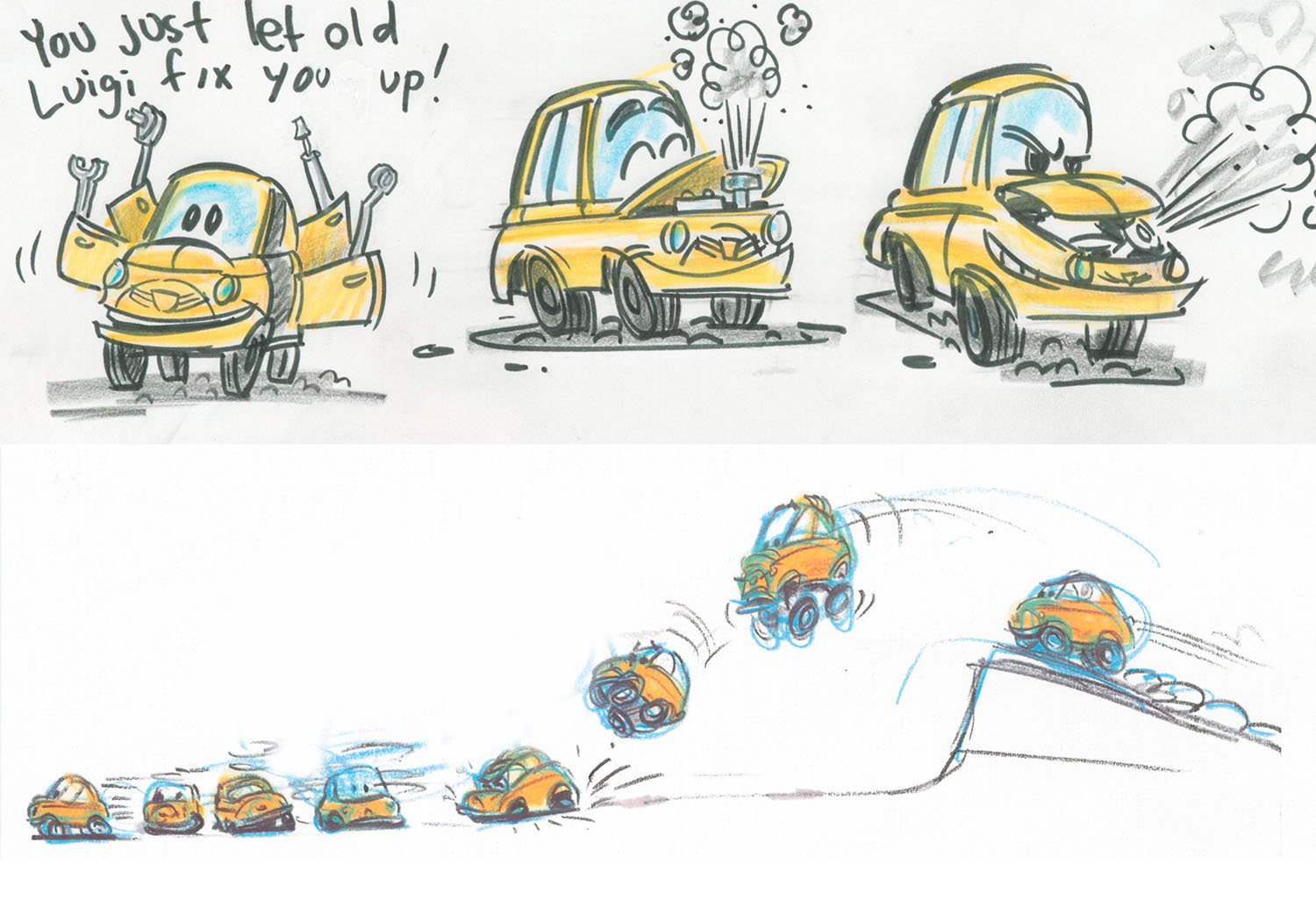 It took three days to prepare the first drawings that would define the Cars landscape. Working from an early inspiration board of automobile and desert references, Production Designer Bill Cone came up with an idea; he spent the day, and that night, thinking of how it could work. Then he rendered several sketches to illustrate his concept that cars, like humans, would shape the world around them as monuments that echoed their likeness. That happened back in 2000, and twelve years later, the landscape became real for generations to visit at Disney’s