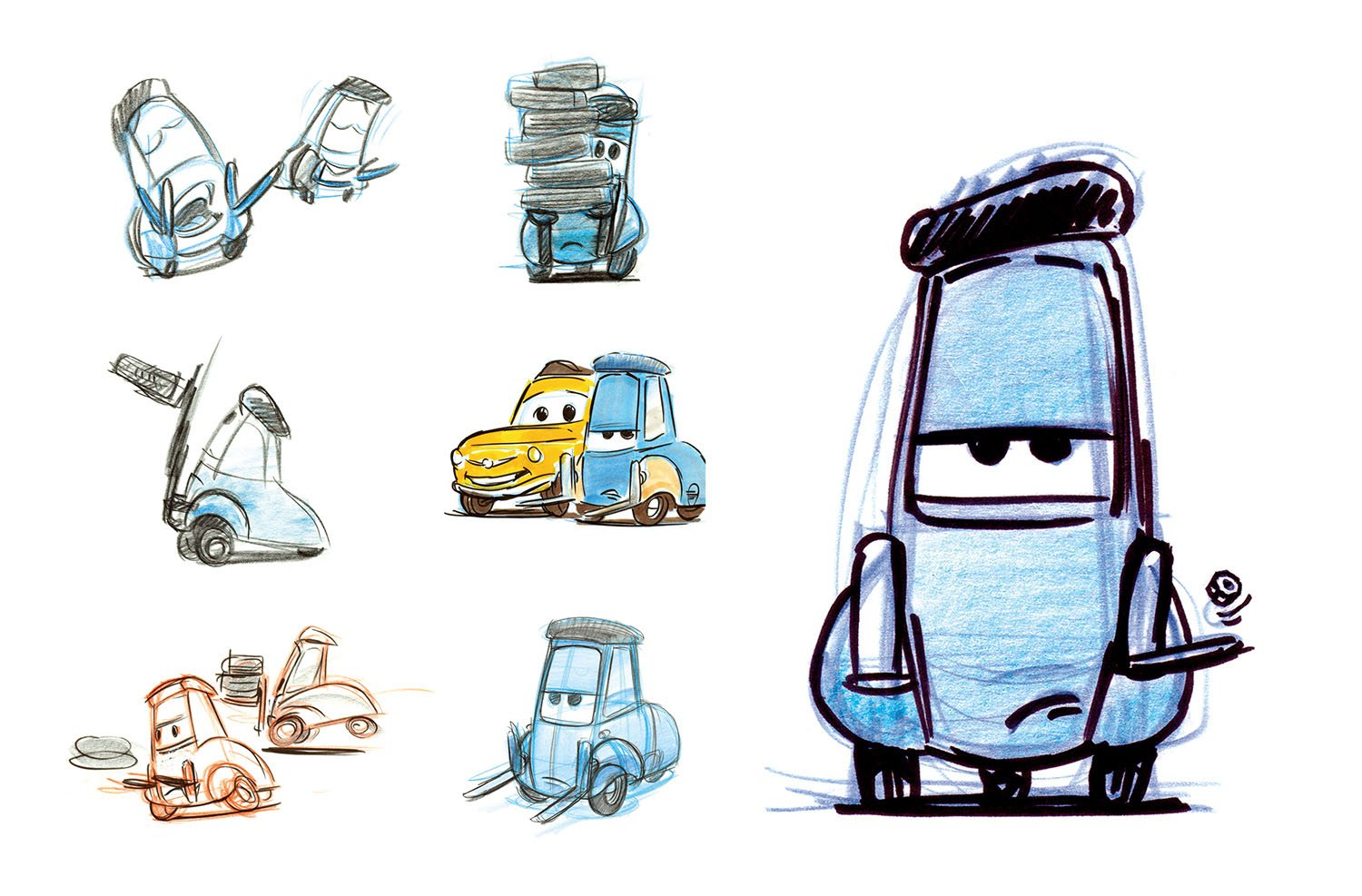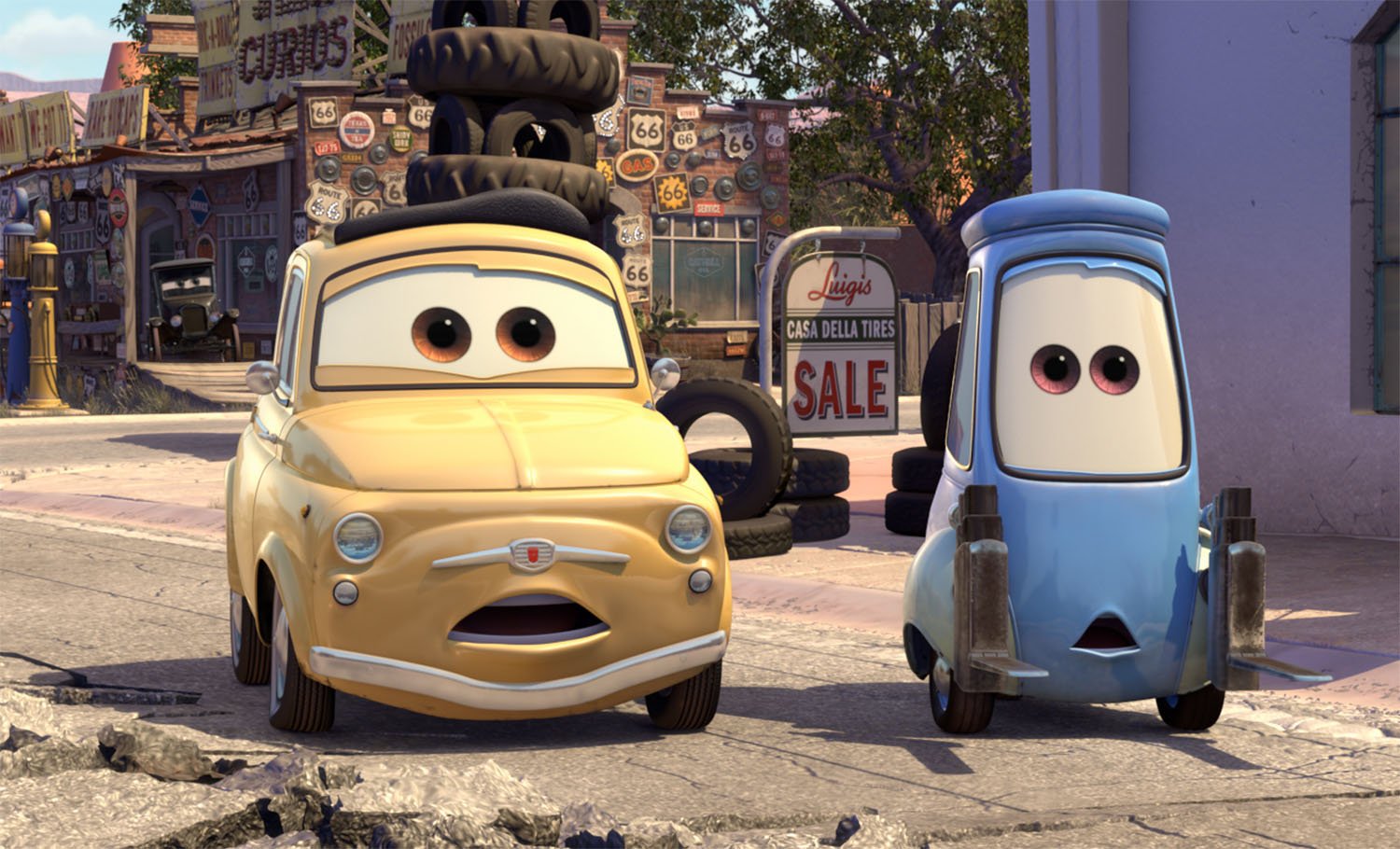Luigi is a 1959 Fiat 500 who runs the local tire shop, Luigi's Casa Della Tires. Big-hearted, gregarious and excitable Luigi is assisted by Guido, a little Italian forklift, and together they serve up more than a new set of wheels for customers. Their positive energy and enthusiasm have a natural way of rubbing off on anyone who passes through their shop doors.