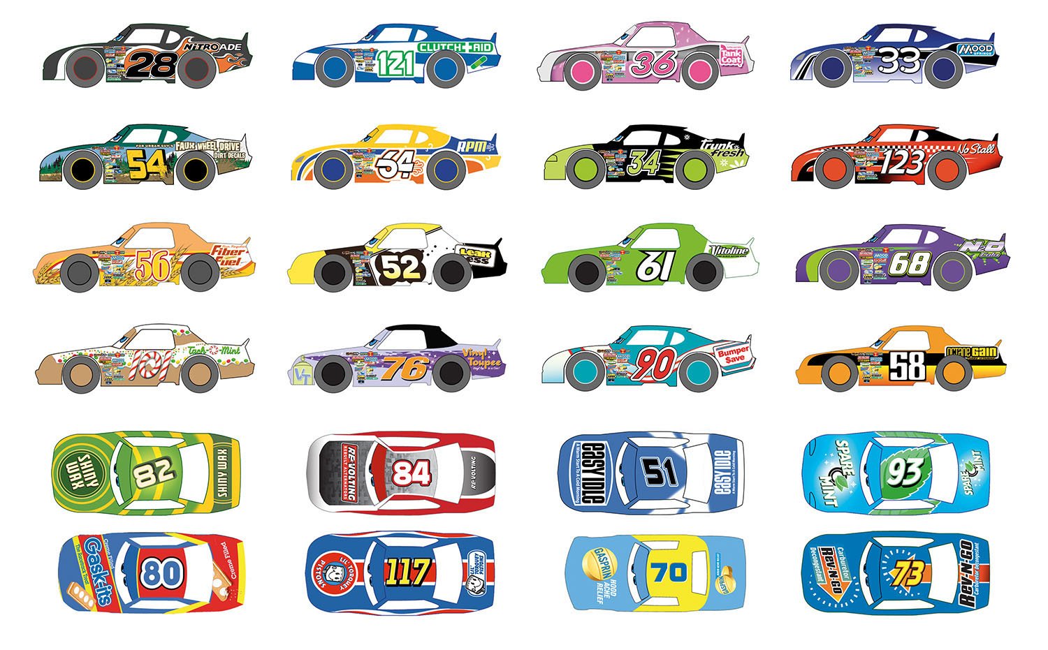 Graphics are not just creations made with words, names, numbers, letters, colors, and typeface—they are opportunities to include hidden stories. The world of Cars called for an unprecedented number of original graphics, split into three major categories: hometown, broadcast news, and stock car racing.