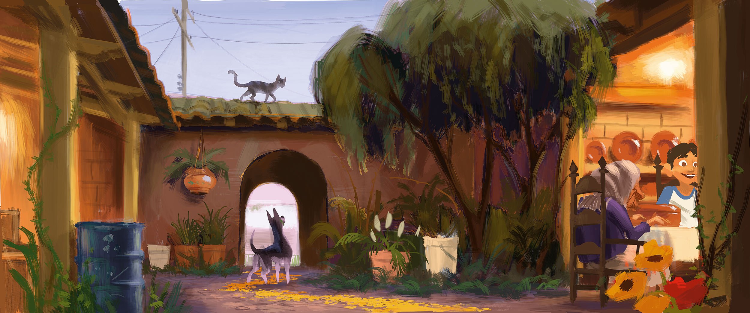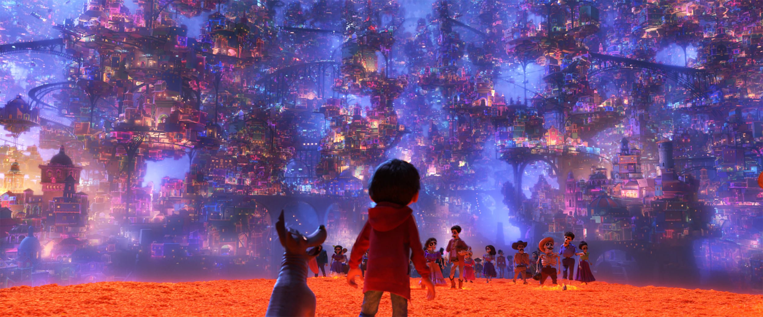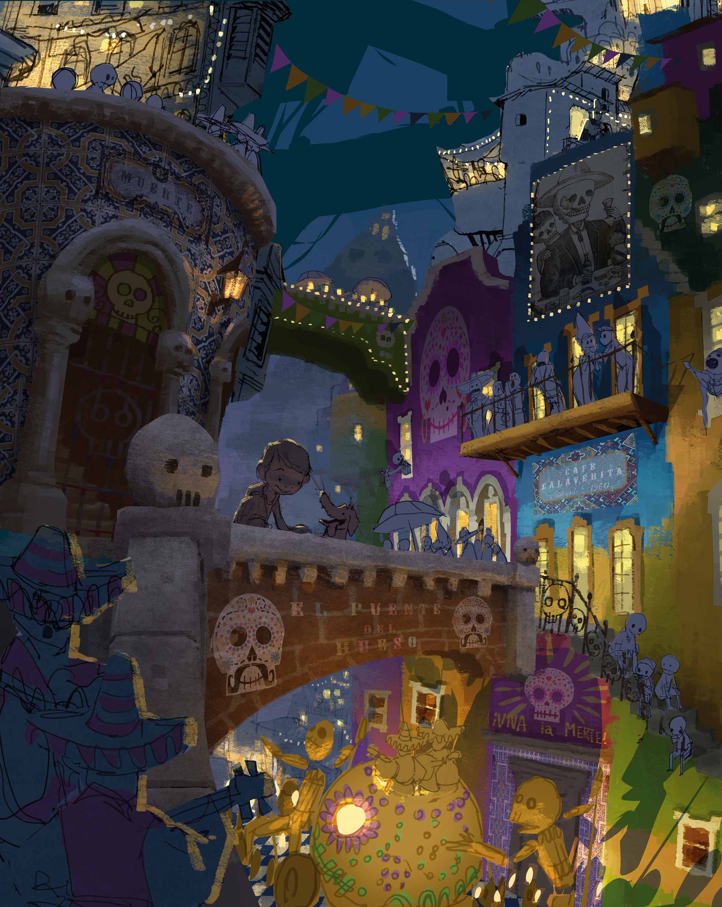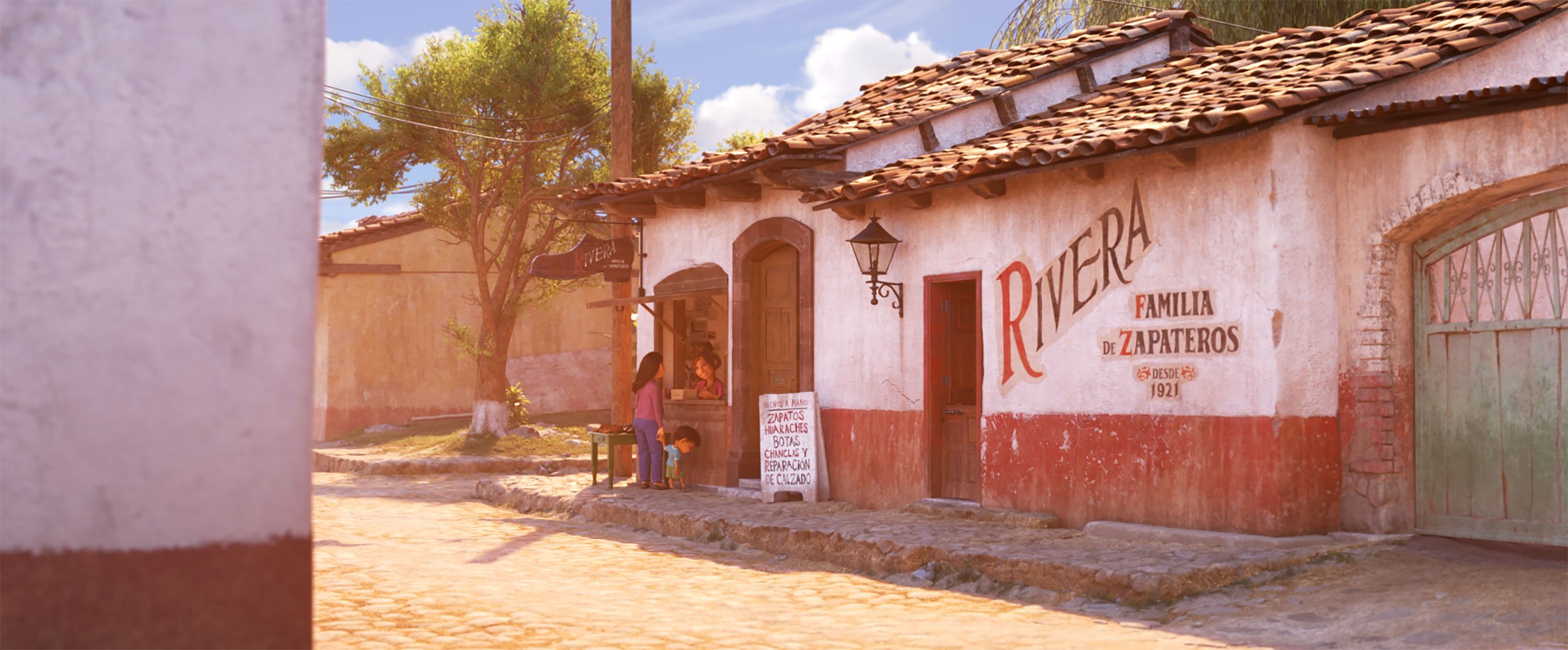 “Santa Cecilia is inspired by real villages in Mexico,” says production designer Harley Jessup. “We stayed grounded in reality in the Land of the Living. It’s sun-bleached and dusty, but the color palette is accented by the brightly colored decorations for Día de Muertos. There’s a town square where people gather, the Rivera compound where Miguel’s great-great-grandmother built the family’s shoe business, and the local cemetery is prominently featured.”