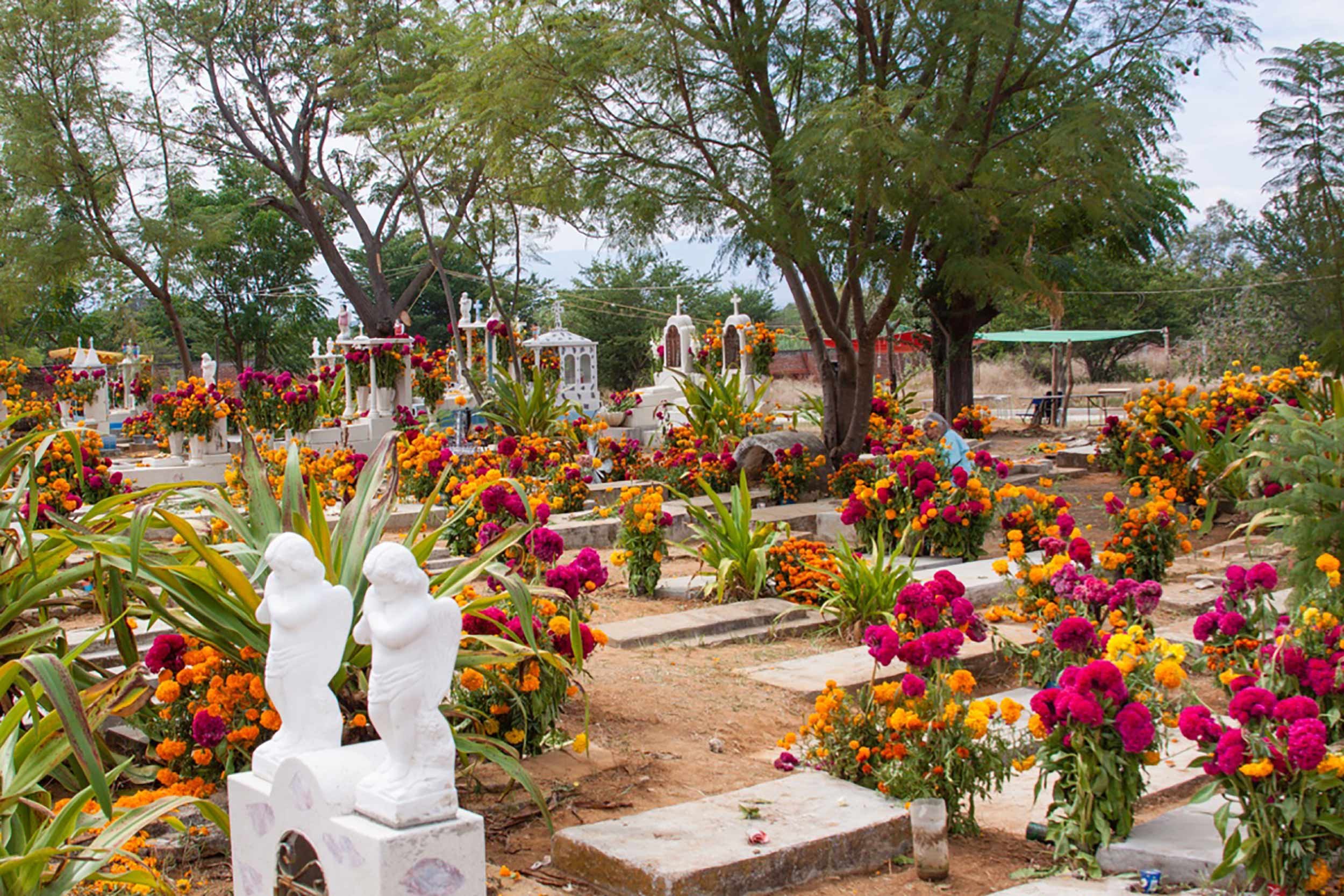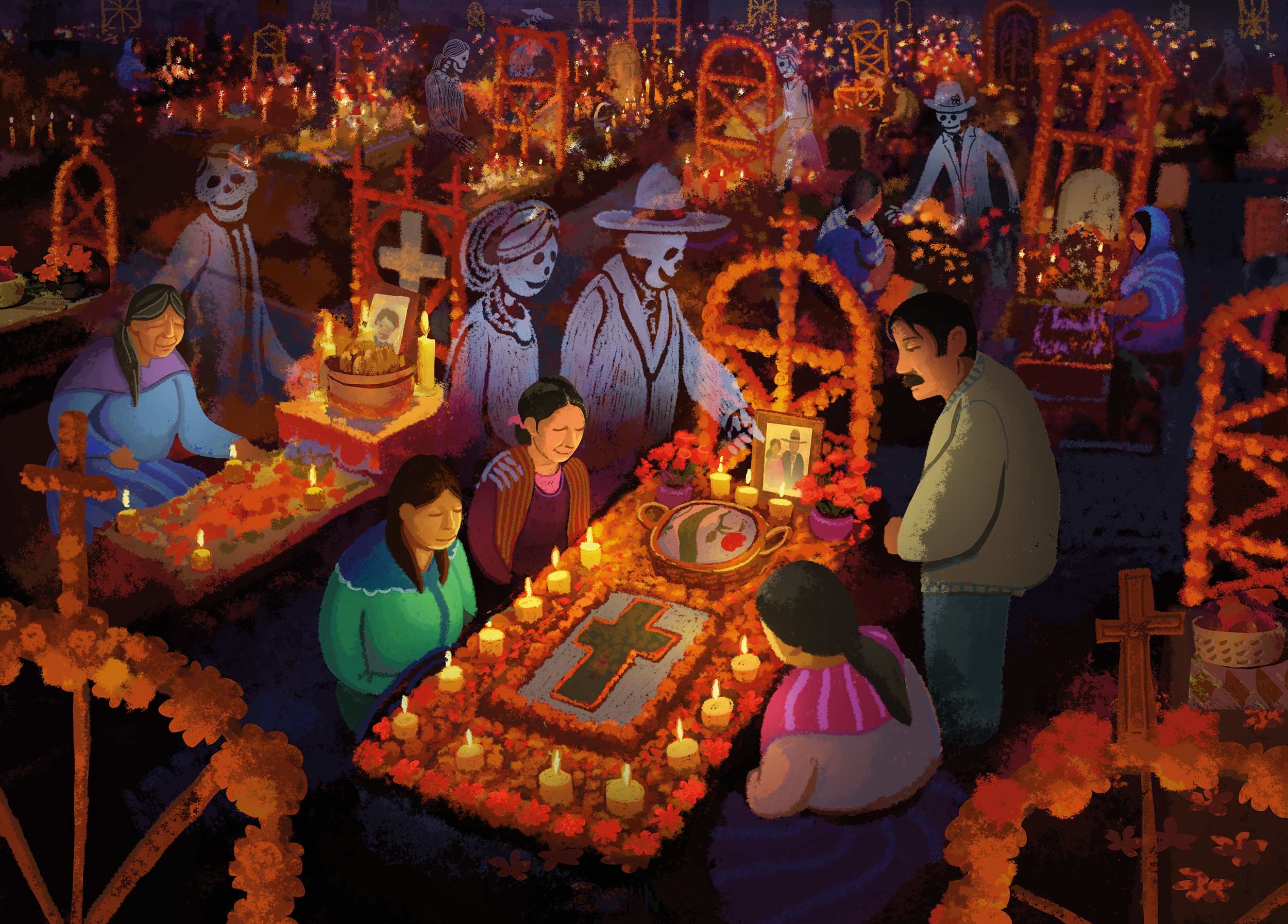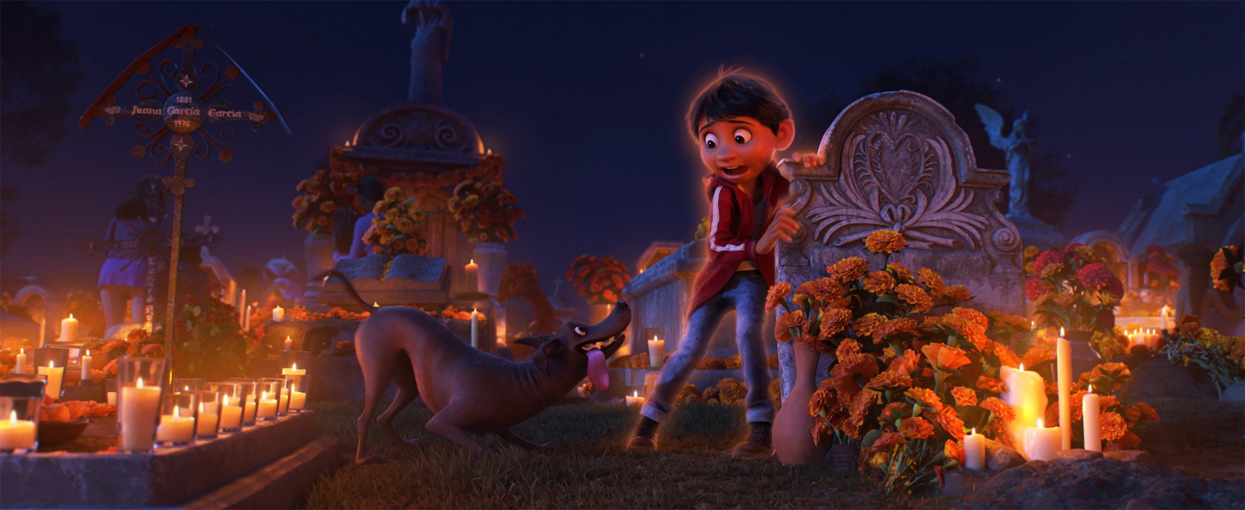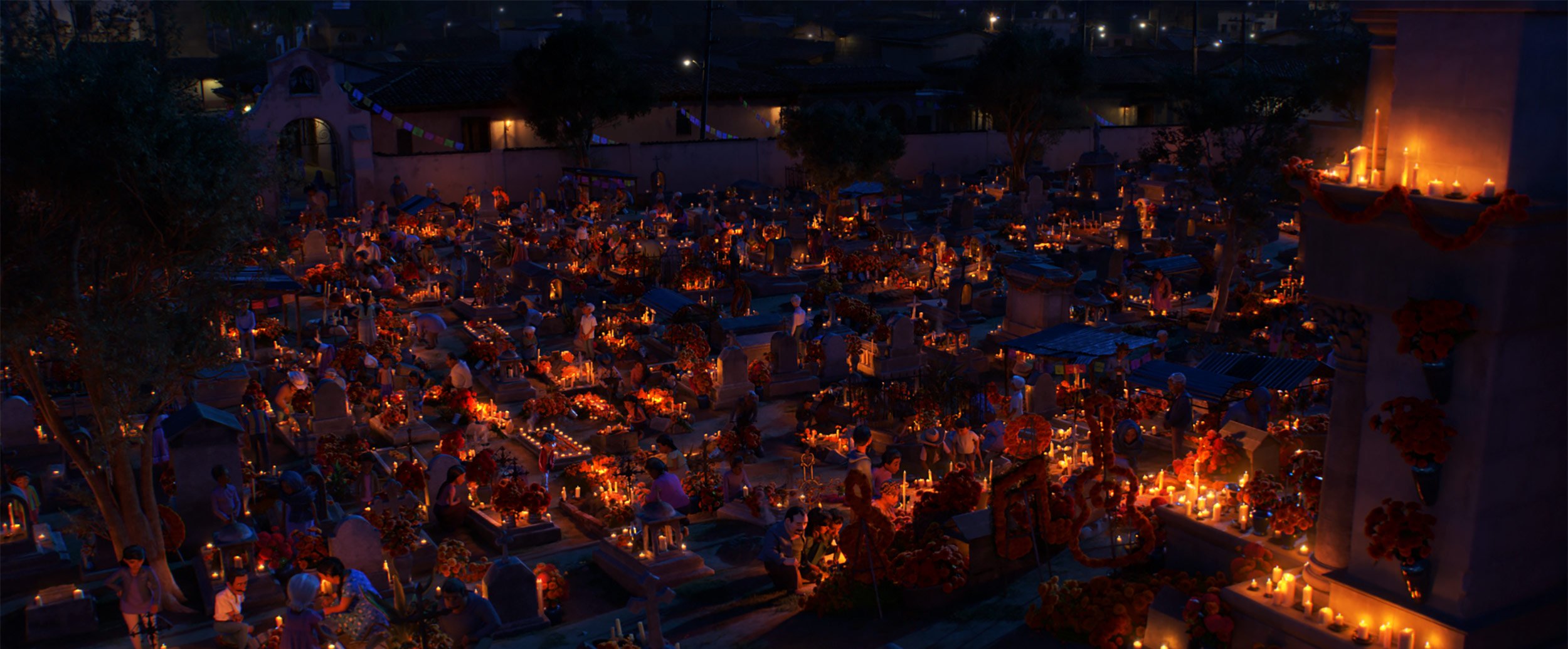 As the locals prepare for Día de Muertos, the Santa Cecilia cemetery is filled with brilliantly colored marigolds and celosia blossoms, as well as handmade decorations and hundreds of candles. “What we saw in Mexico for the holiday really redefines the idea of a cemetery,” says Danielle Feinberg, director of photography - lighting. “It’s not dark and sad; it’s festive. Thousands of candles put off this beautiful orange glow, which creates a wonderful mood—romantic, warm, and interesting. I’ve never seen anything like it.”