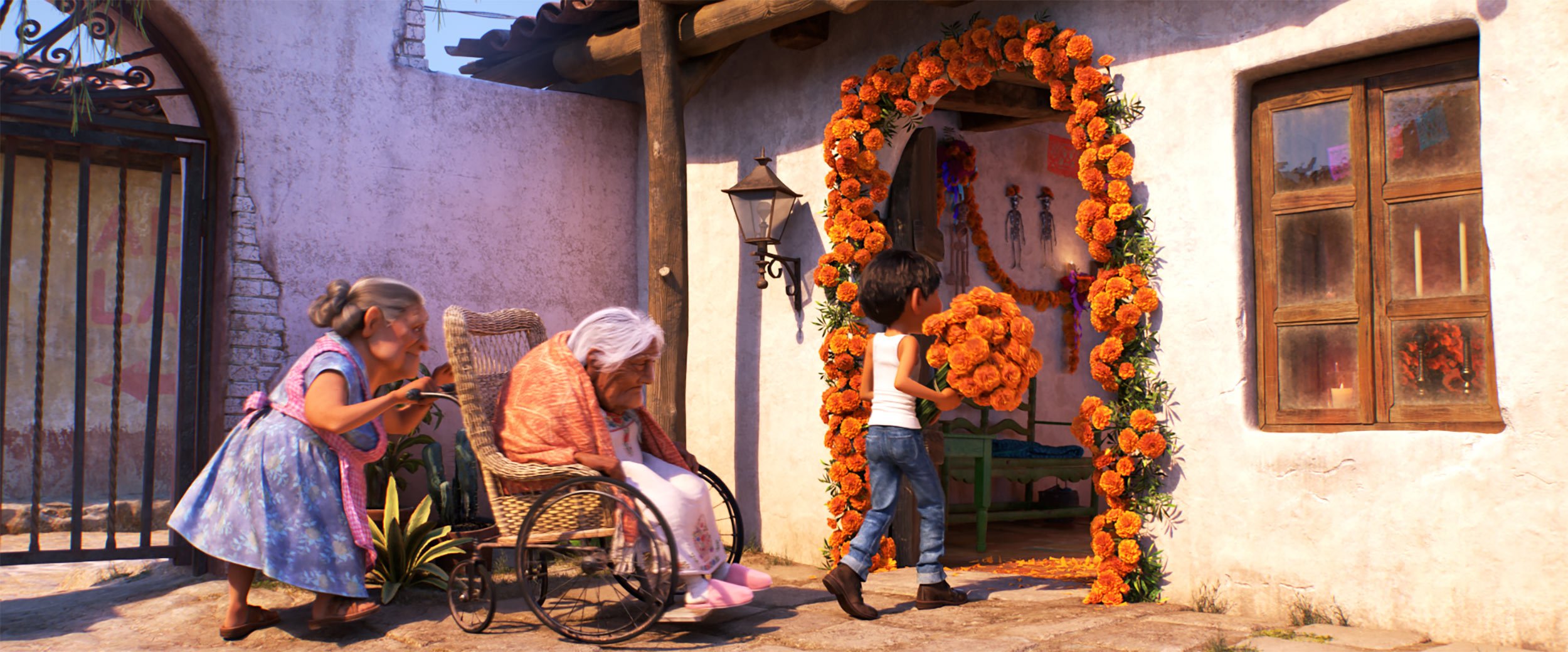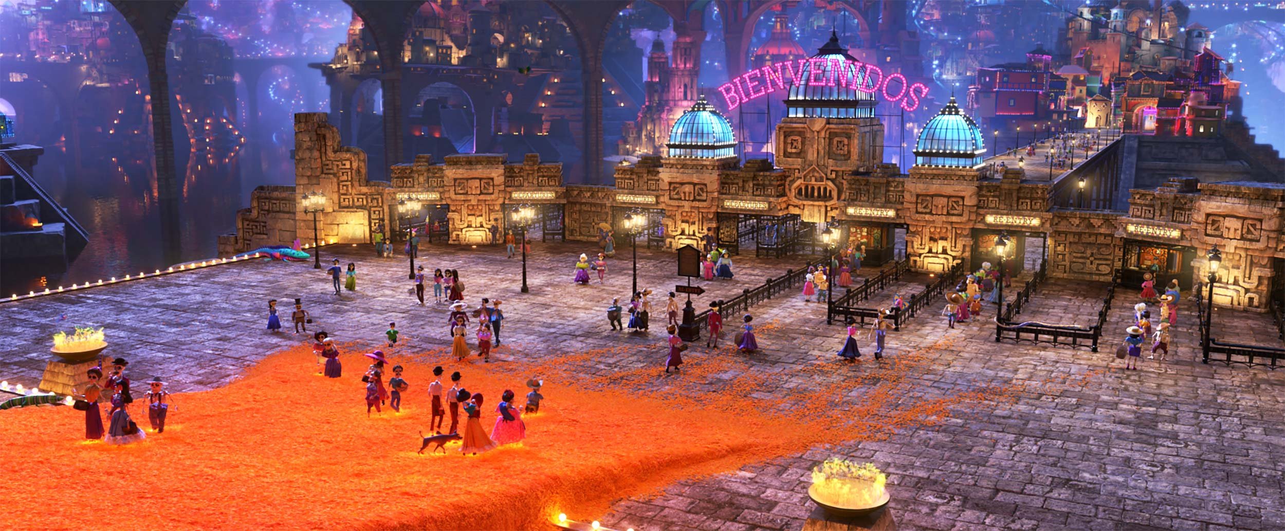 As filmmakers created the two worlds of “Coco,” they knew they’d need to connect the worlds in a very magical way. Their research trips sparked something spectacular. “When we were invited to take part in Día de Muertos in Mexico,” says director Lee Unkrich, “we saw paths made of marigold petals that started out in the streets and ended at ofrendas—altars with family pictures, favorite foods and special objects. We learned that it was all done to help guide the spirit of a family’s loved one home.”