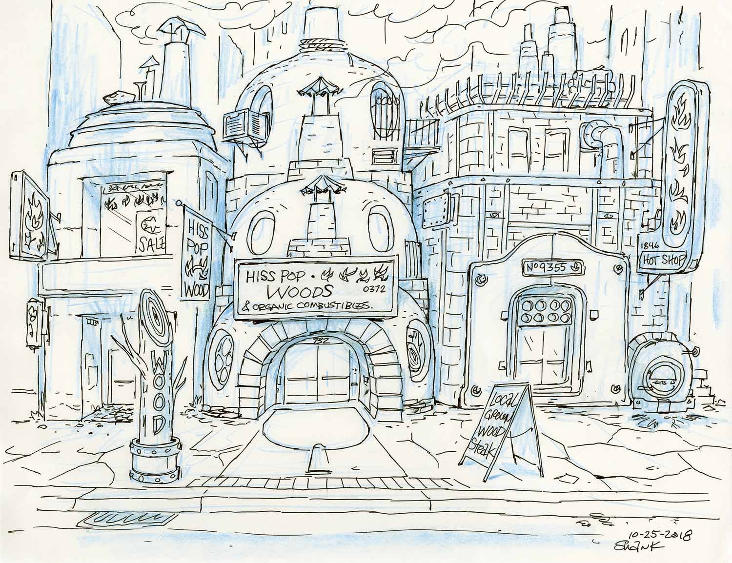 Beyond the puns, Meyer—a one-person team—was responsible for everything from the prominent signage—like the Fireplace sign of Ember’s family shop and the motion graphics in Cyclone Stadium—to the verbiage aboard the Wetro—the water-themed transport system. “The Wetro schedule is there—it looks like a periodic table—and there are loads of ads,” says Meyer.” .