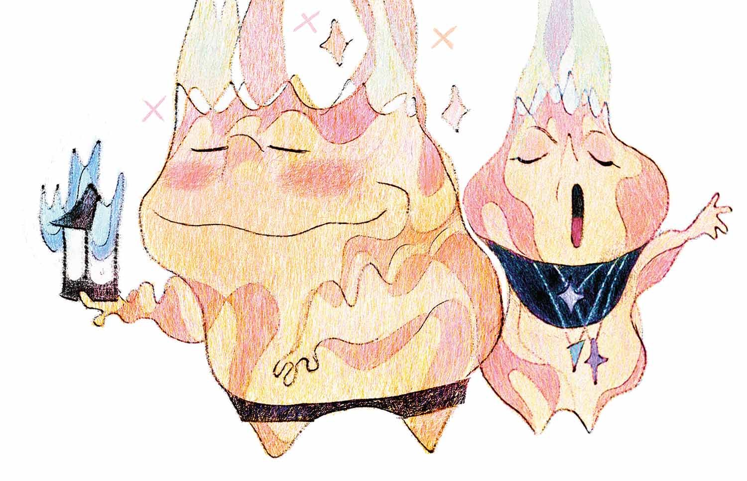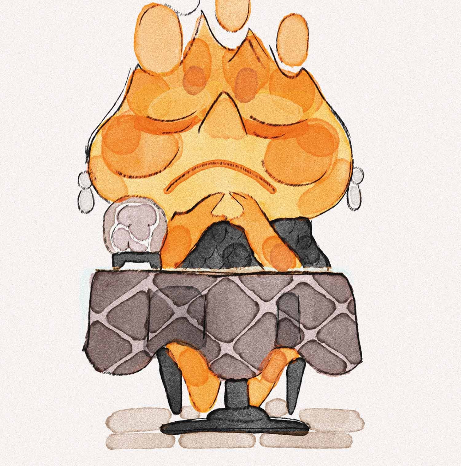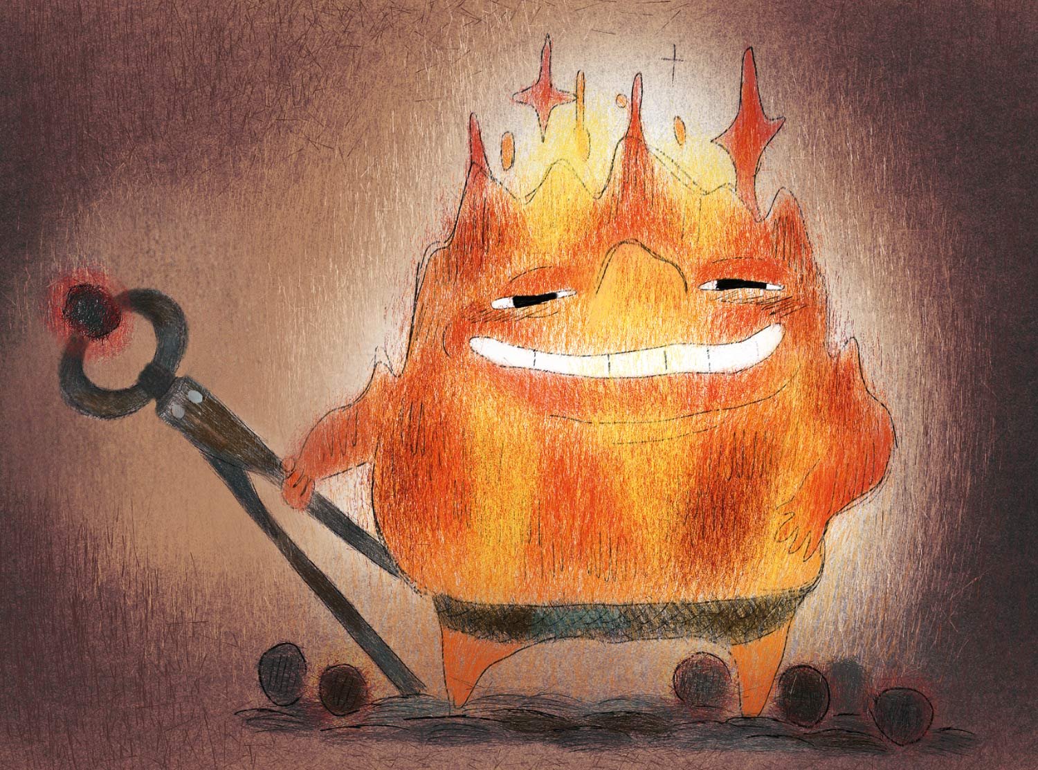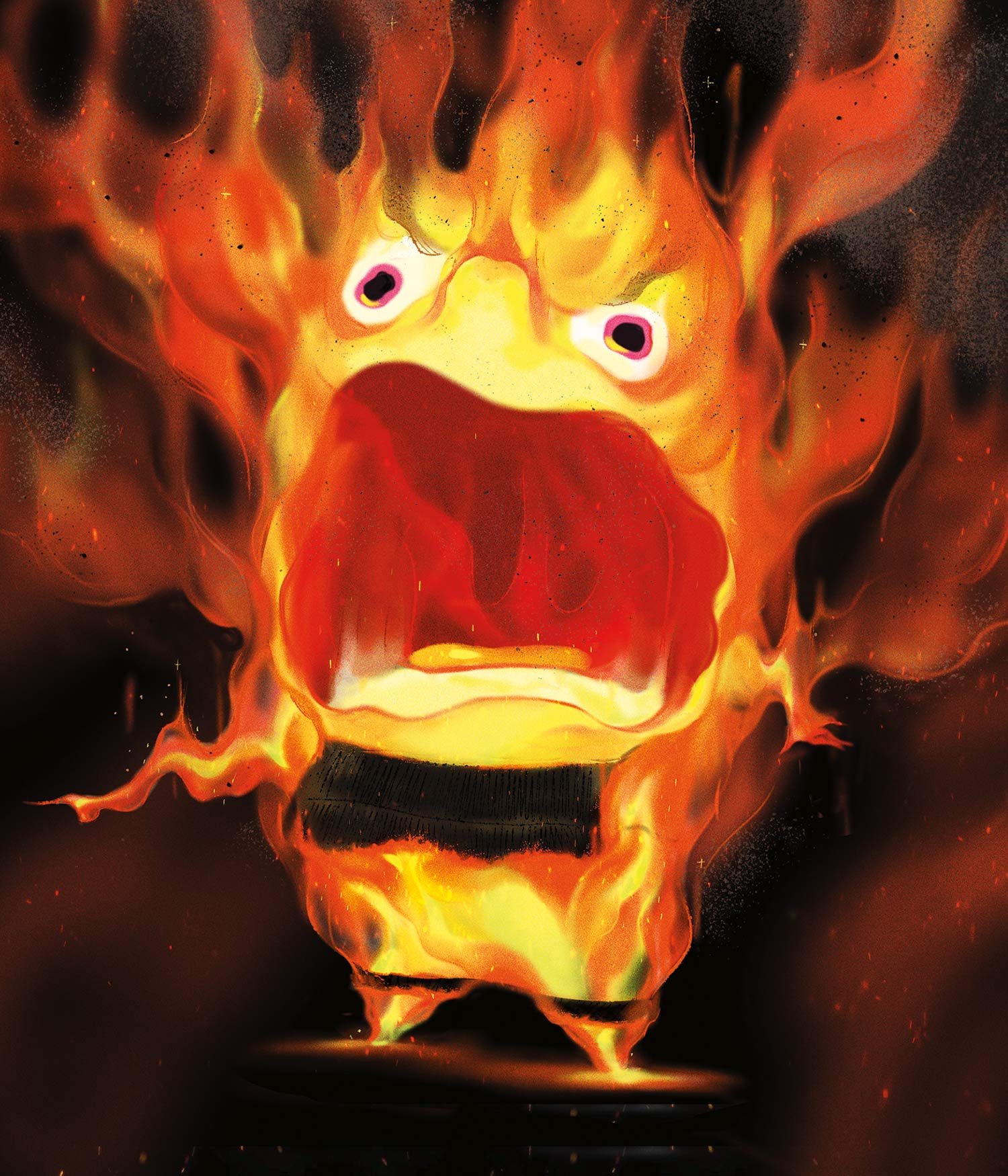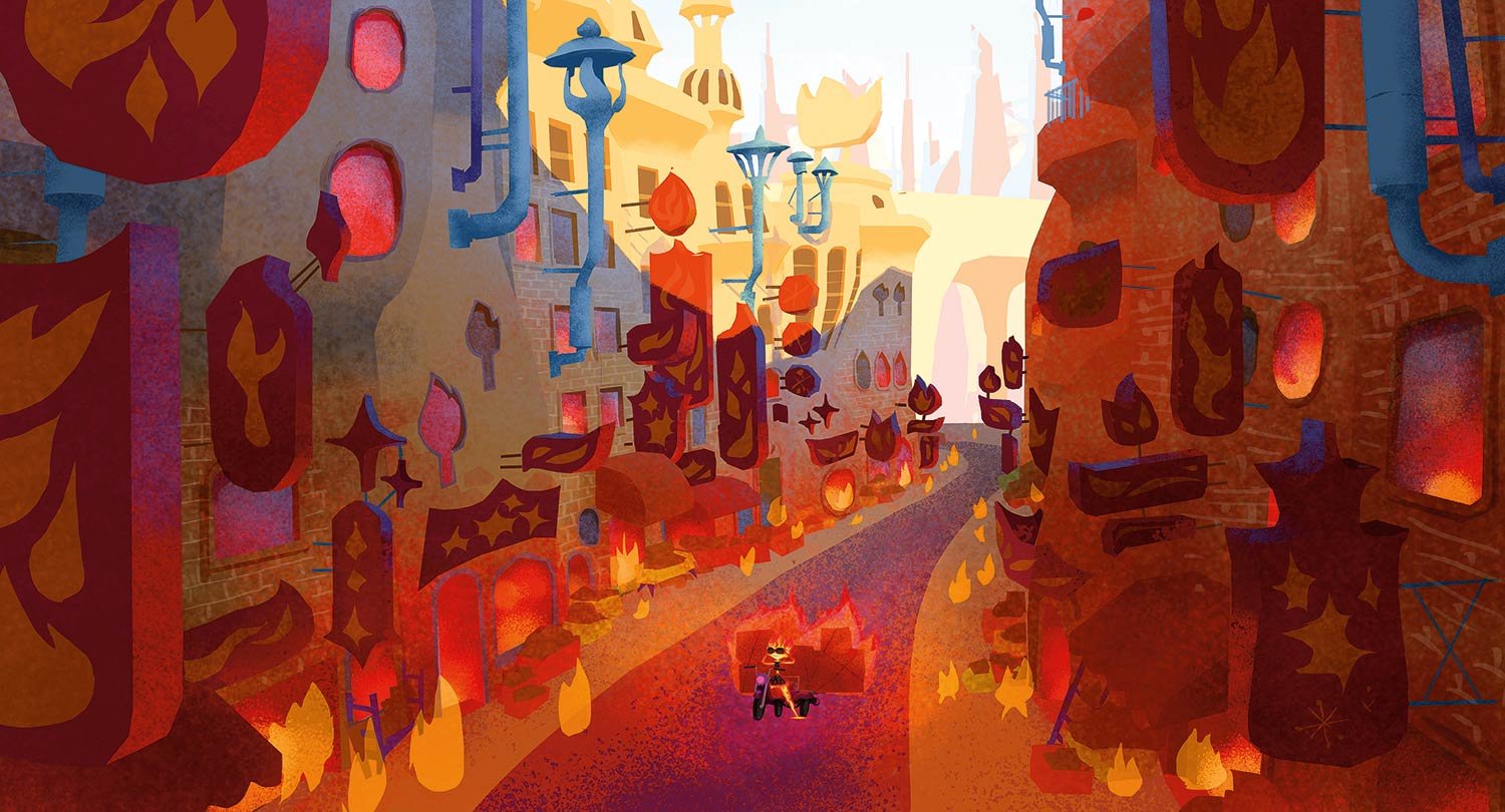 The textures and palette of the materials of Firetown were selected to underscore who was using them—without being too on the nose. “We couldn’t go too realistic,” says color and shading art director Jennifer Chang. “We didn’t want to char the whole thing. But we liked textures that might come from torching it like a crème brûlée. We played with pattern and specularity of objects. All the set design was pushing the idea of the shape of the flame—the triangle, diamond or a candlelight feeling to it. The shading considered all of the wear and tear—how flame would interact with this furniture in this world, while expressing it in the theatrical way.”