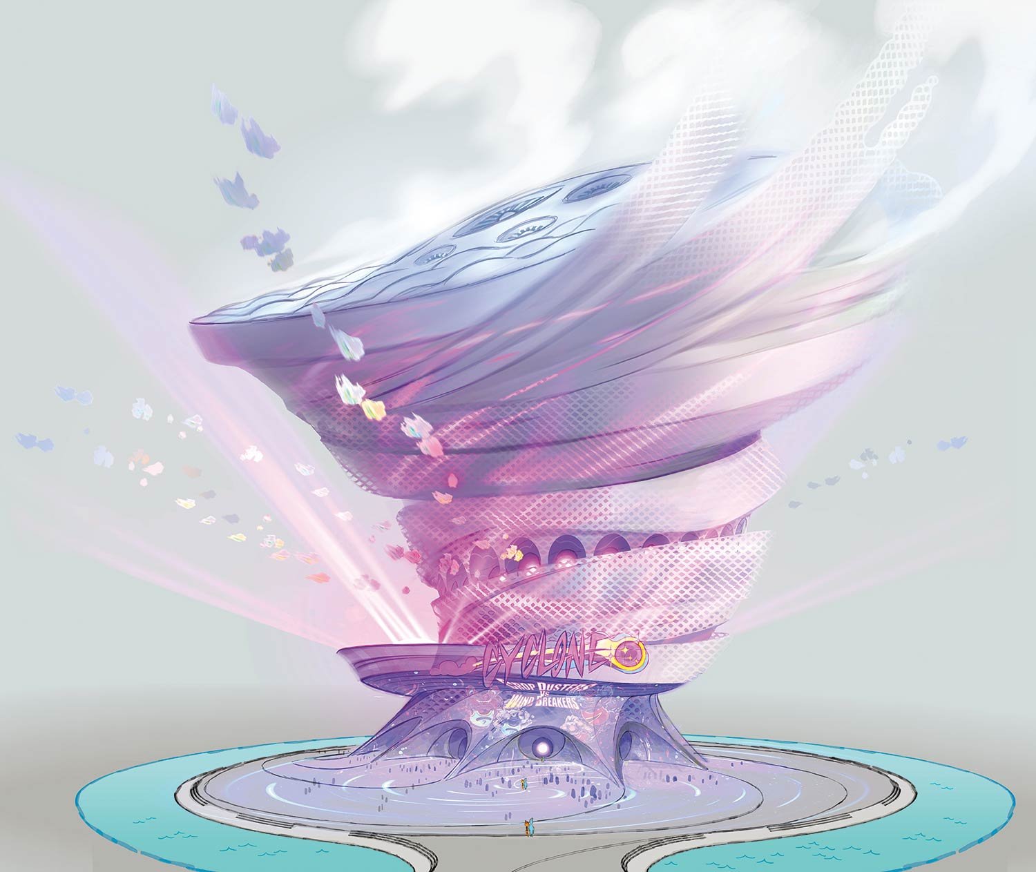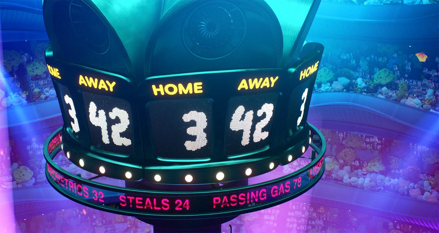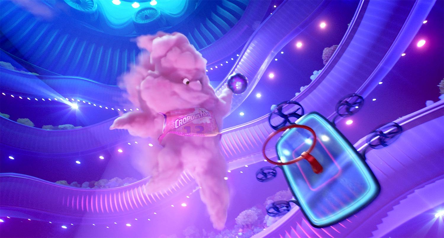 It’s fitting that Cyclone Stadium would lead the pack in terms of kinetic architecture. “It’s a space for a game that is totally made up,” says Cho. “And Air Ball players can move in three dimensions, so we have a lot of pieces that are moving in that set. First of all, there are a bunch of fans inside the stadium. Below the seats, there are these gills with lights behind them that open and close in waves across stadium, adding excitement. Outside the stadium, while it’s static, the overall shape is meant to feel very dynamic—it’s a cyclone captured in time. To put it in motion, so to speak, there are little panels that sparkle and shimmer. Everything is alive and organic and awesome.”