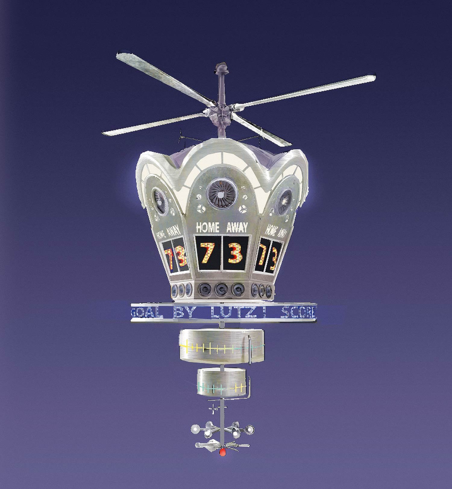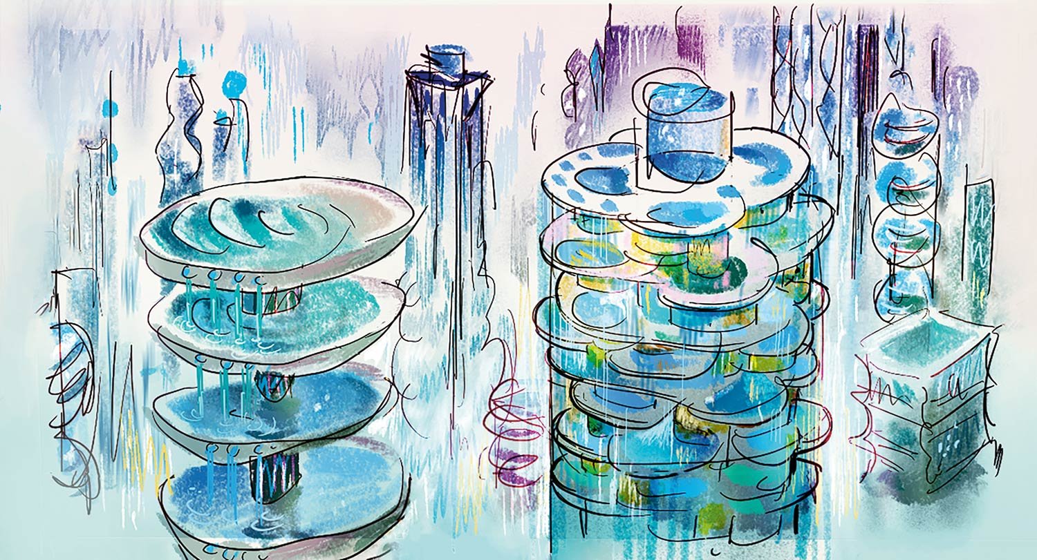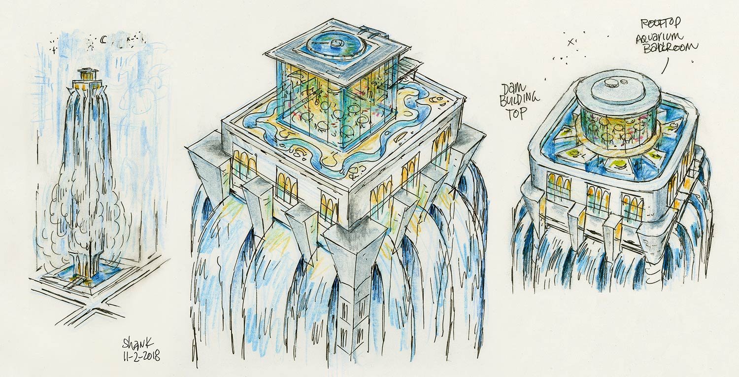 It’s fitting that Cyclone Stadium would lead the pack in terms of kinetic architecture. “It’s a space for a game that is totally made up,” says Cho. “And Air Ball players can move in three dimensions, so we have a lot of pieces that are moving in that set. First of all, there are a bunch of fans inside the stadium. Below the seats, there are these gills with lights behind them that open and close in waves across stadium, adding excitement. Outside the stadium, while it’s static, the overall shape is meant to feel very dynamic—it’s a cyclone captured in time. To put it in motion, so to speak, there are little panels that sparkle and shimmer. Everything is alive and organic and awesome.”