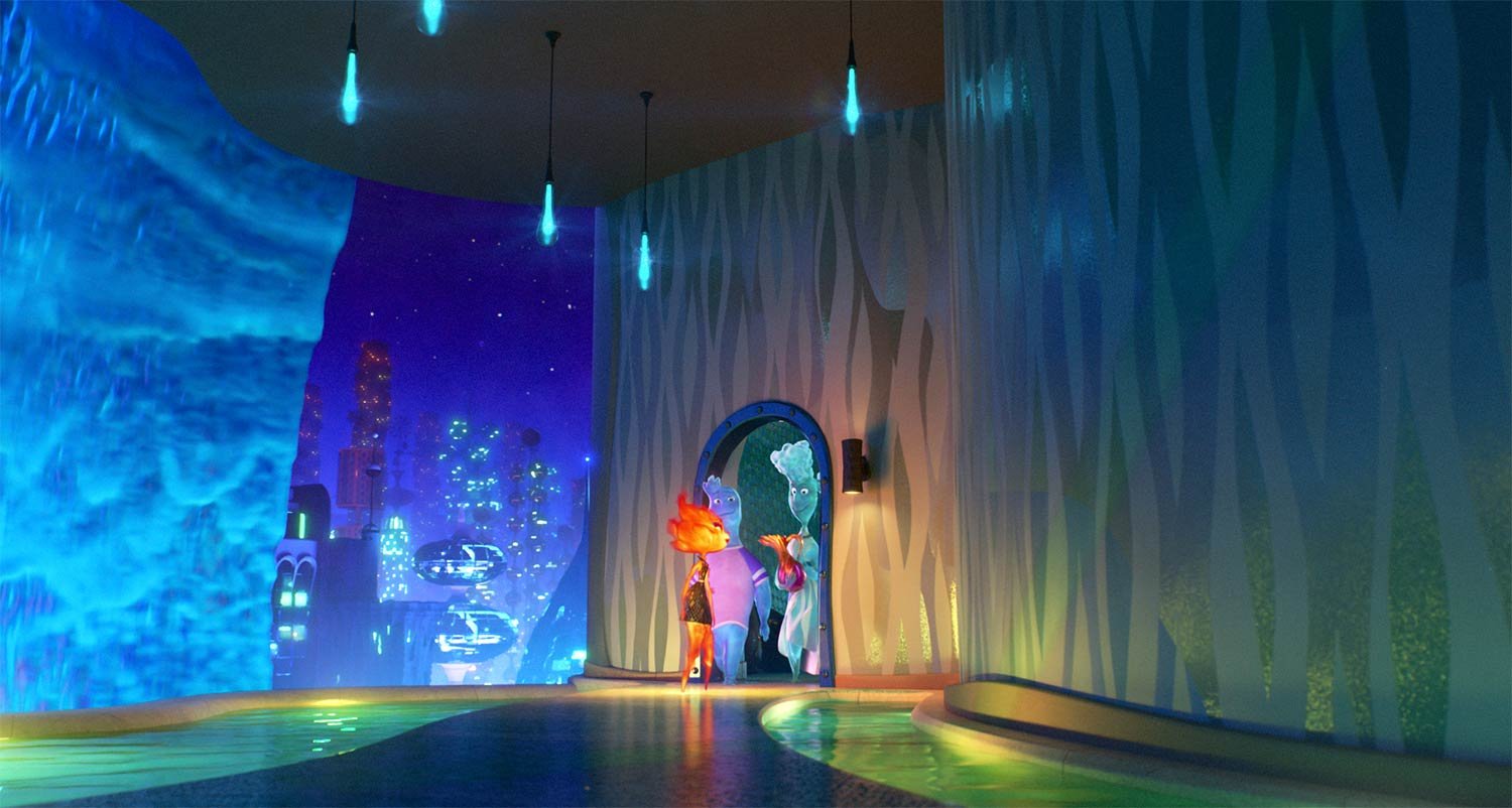 There’s nothing quite as uncomfortable as meeting that special friend’s family for the first time, as Ember discovers when Wade invites her to dinner at his mom Brook Ripple’s home. Says sets supervisor Jun Han Cho, “Wade’s mom’s apartment is a very exclusive penthouse, so we wanted the elegance and grace of someone who can afford something like that. At the same time, we wanted to have fun—her apartment is essentially a big indoor pool. There is a feeling of contemporary architecture—concrete, glass—but there are also pool noodles, lane lines and pool floaties for furniture. It all makes you enjoy the fact that Water people would, of course, live in an indoor pool. It’s so fun, but it also adds to Ember’s discomfort out in the world—how does a Fire character sit on a pool floaty without popping it?”