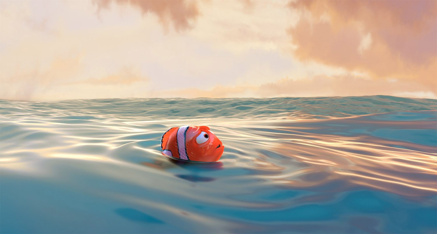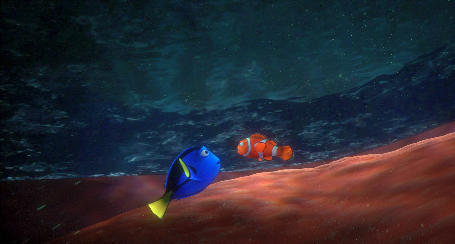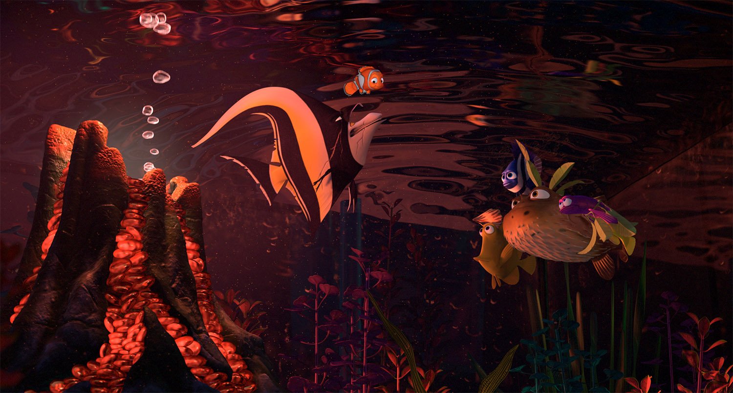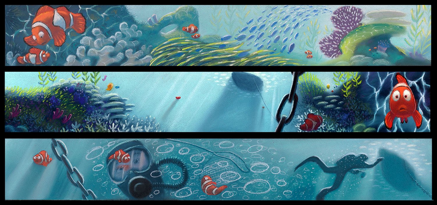 For Finding Nemo, Production Designer Ralph Eggleston started with the vibrant palette of the underwater reef, among the most naturally colorful environments on Earth, then shifted to an increasingly minimalist and ominous palette as Marlin and Dory descend into the murky depths of the ocean on an increasingly perilous journey.