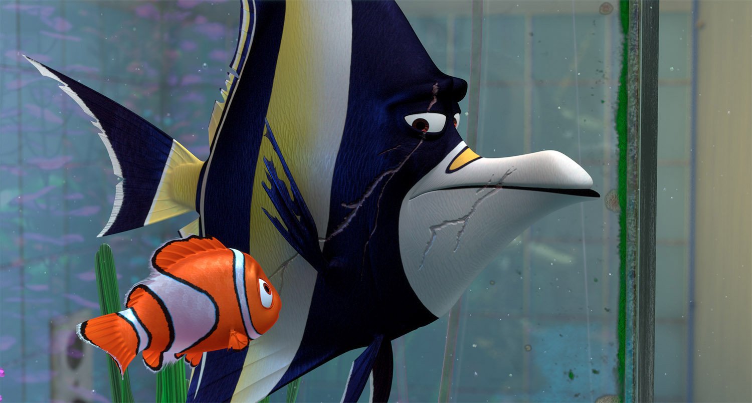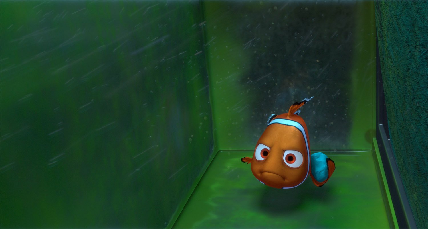 Intended to amuse children visiting the dentist’s office, the fish tank in Finding Nemo can also be viewed as a glass prison for its unlucky inhabitants. Looking to illustrate the odd dichotomy, the filmmakers found inspiration in the world of kitsch aquarium accessories and began filling the tank with garish plastic objects. When we meet them, we find the tank gang has gone slightly mad, prisoners not only of their narrow confines but also the dentist’s bad taste.