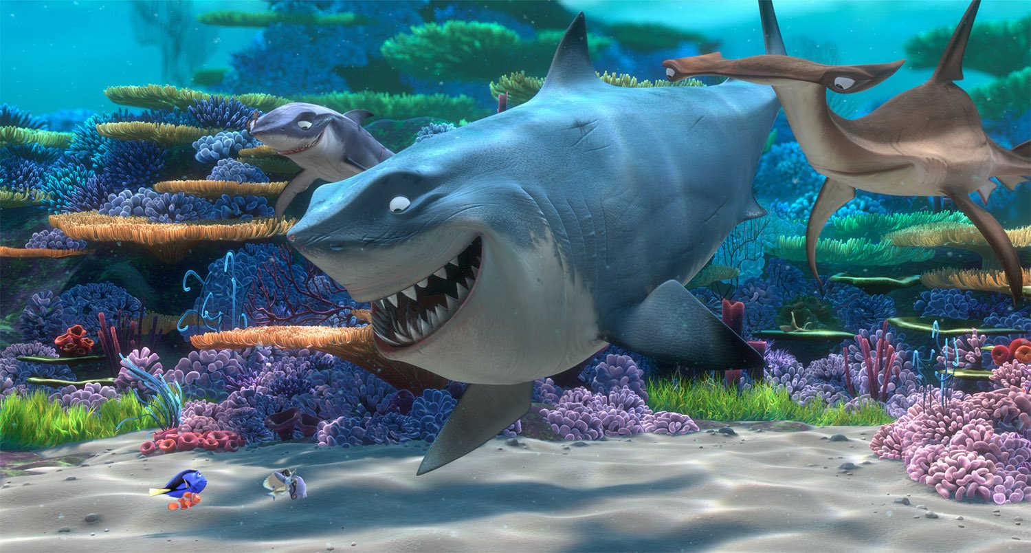 The filmmakers wanted a chase scene involving Dory, Marlin, and great white shark Bruce. Many scenarios were being considered when a team field trip to a submarine docked at a San Francisco pier revealed that submarine floors are actually grates. With that simple fact in mind, the Pixar team envisioned a wild escape sequence set in the wreck of an old World War II era submarine sunk in the Great Barrier Reef.