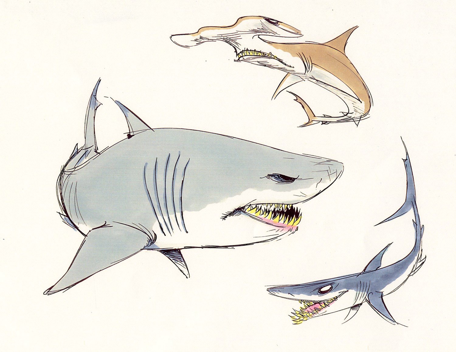 Bruce, Anchor and Chum are mates. Anchor is cynical; he hates dolphins. Chum is hyperactive; he can’t keep still. Bruce is the jolly leader of the pack. All three are members of a Fish-Eaters Anonymous Group, and are tormented by their natural urge to eat fish and their resulting unpopularity amongst the general ocean population. Consequently, they have embraced a “veggie” lifestyle, allegedly swearing off fish, and living off politically correct kelp instead.