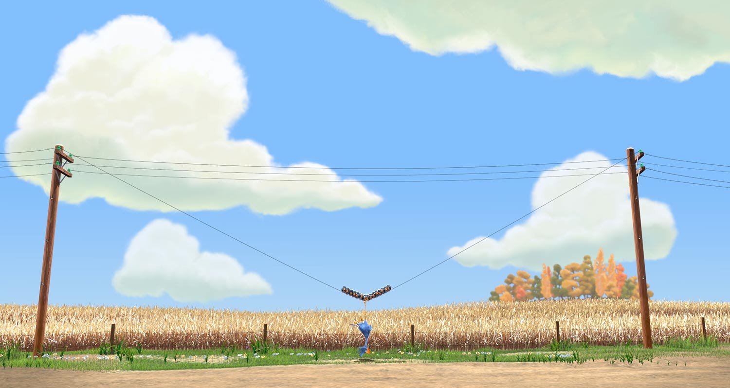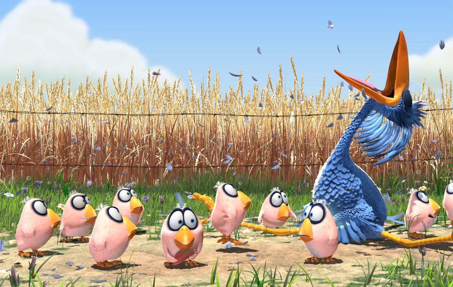 One by one, a flock of small birds perch on a telephone wire. Sitting close together has problems enough, but then along comes a large dopey bird that tries to join them. The birds of a feather can't help but make fun of him—and their clique mentality proves embarrassing in the end.