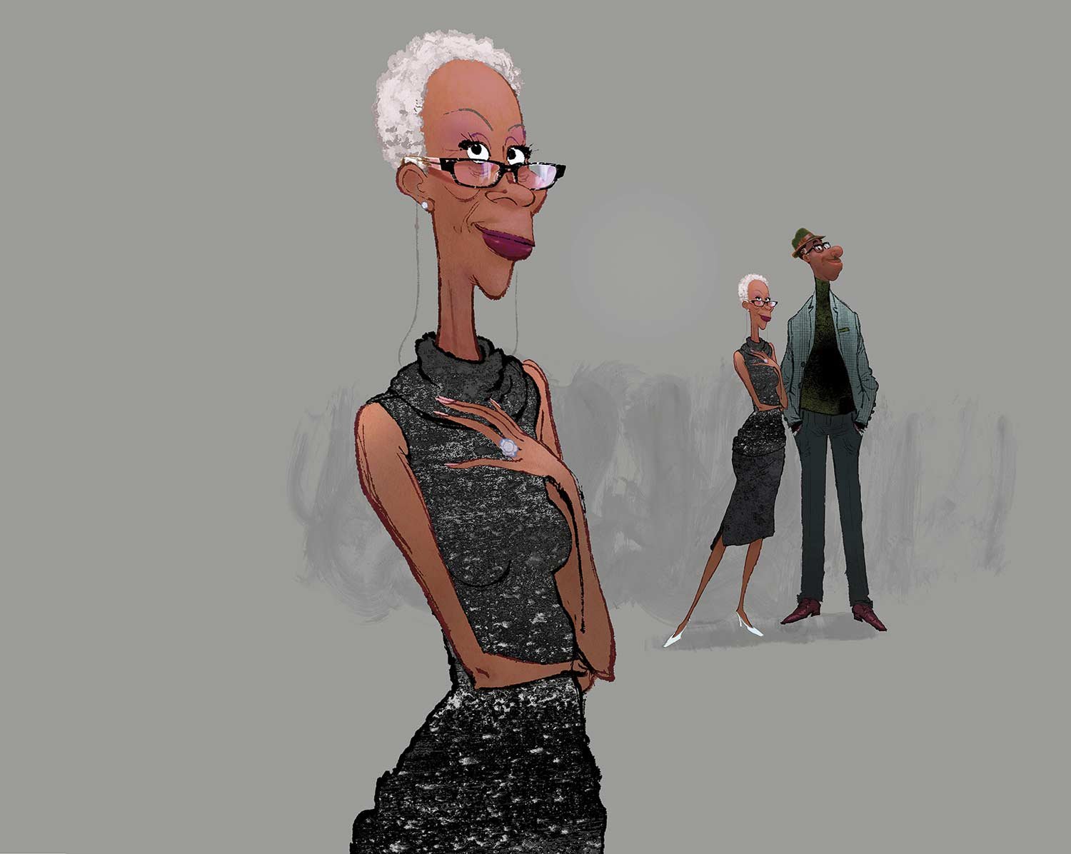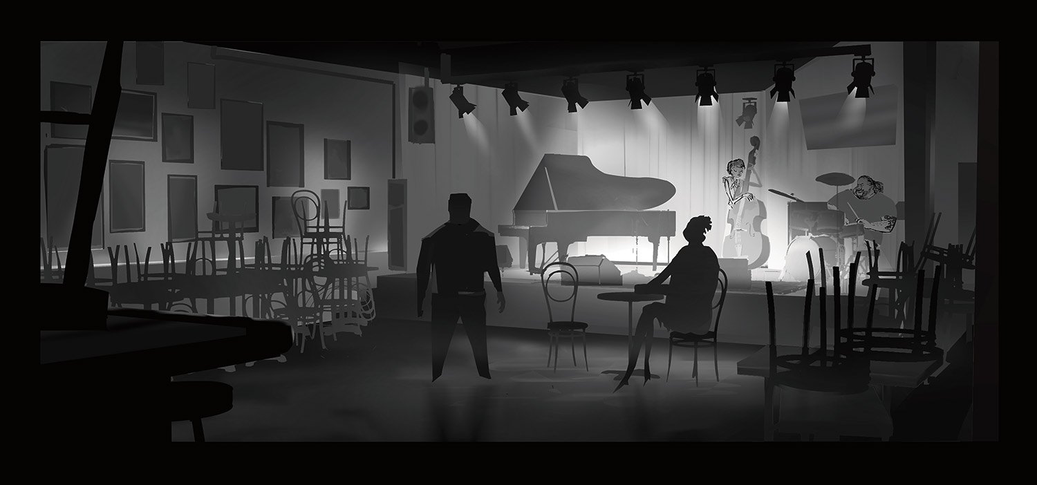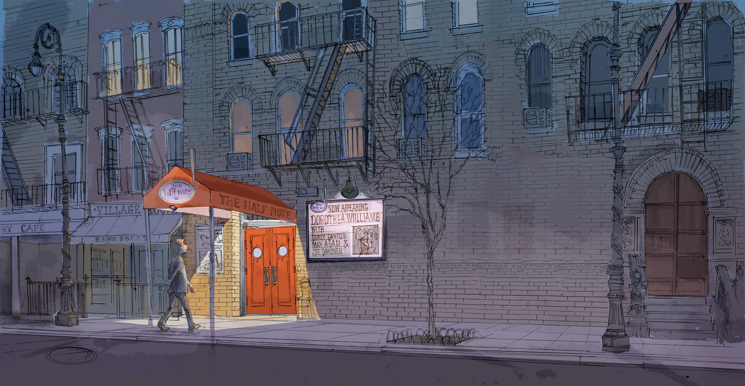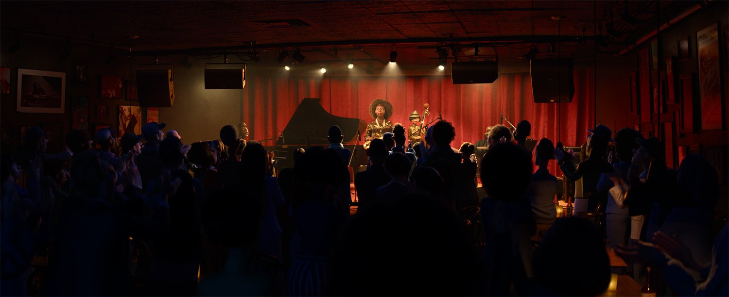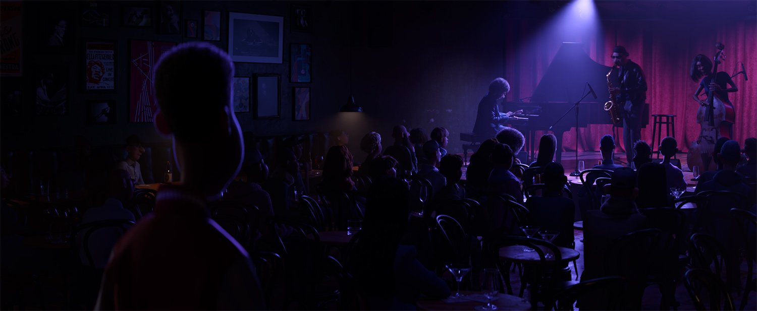 Research is an important part of Pixar’s films, taking filmmakers to places ranging from landfills to Scotland. “Soul” called for some of their best research to date. “We visited a number of jazz clubs,” says production designer Steve Pilcher. The Half Note is pretty true to scale of the typical size of a jazz club. We didn’t want to break the tradition and history and the richness of the clubs. The atmosphere is authentic, but contemporary. It was a pleasure and honor to create portraits of Jazz Greats to place on the walls of the club.”