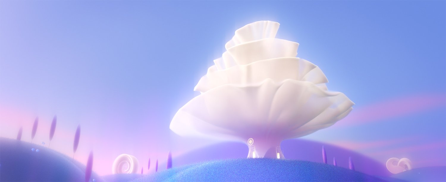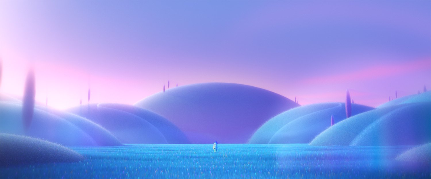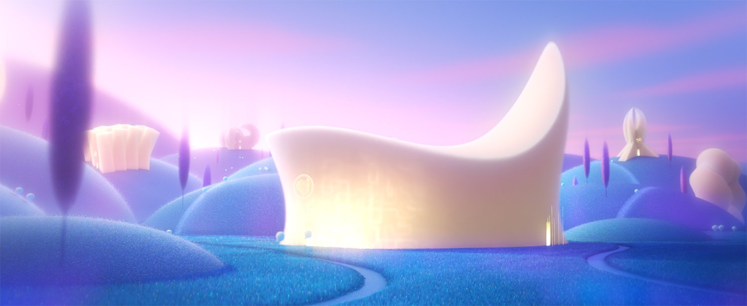 Personality Pavilions are individual buildings where new souls go to get their personalities. According to sets art director Paul Abadilla, each pavilion is an abstract representation of the personality trait. “We leave some of them up to interpretation, because there are so many possibilities,” says Abadilla. “But our hero pavilions use iconic shapes—the Aloof Pavilion, for example, looks like a nose pointed up in the air. It’s a quick read that’s supported by the characters’ performances.”