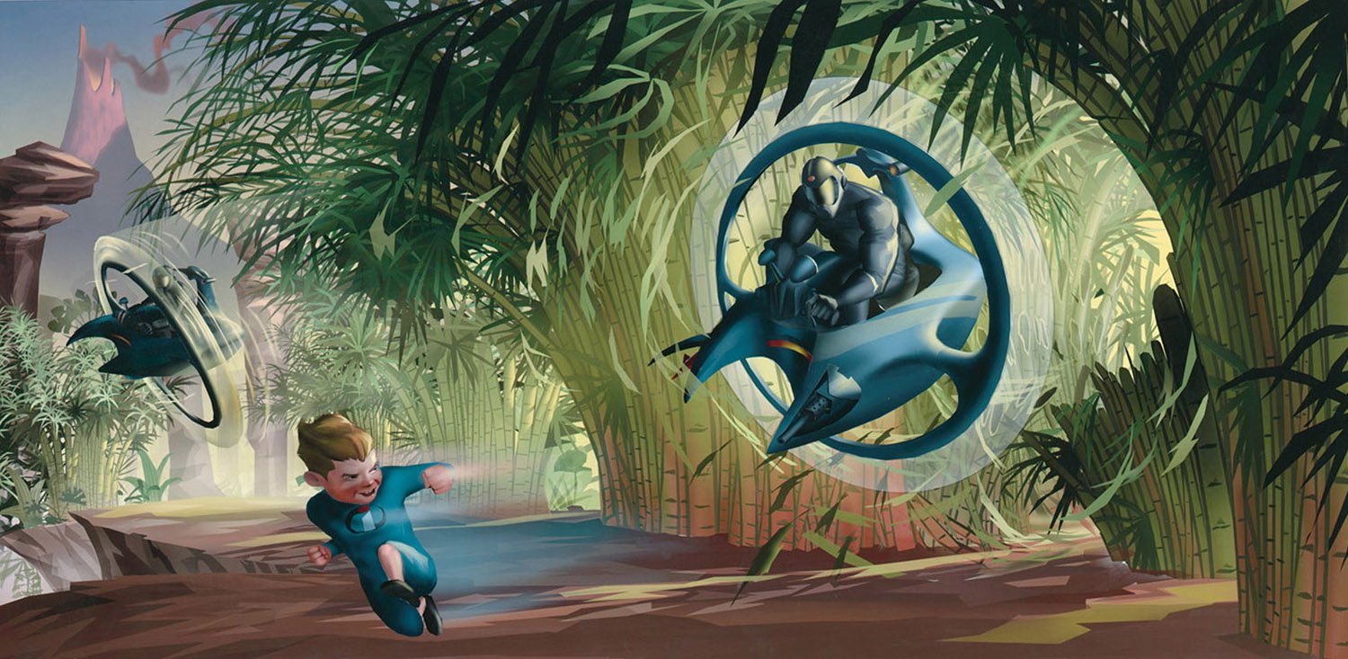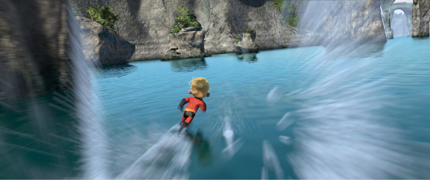 “Each character sees the island from their own perspective,” explains Story Supervisor Mark Andrews.“Bob uses his strength and knocks out a guard with a coconut. Helen sees the island in a more stealthy way. For the kids, who haven’t been allowed to use their superpowers, the island is a trial by fire, particularly with Dash being chased and having to finally use his