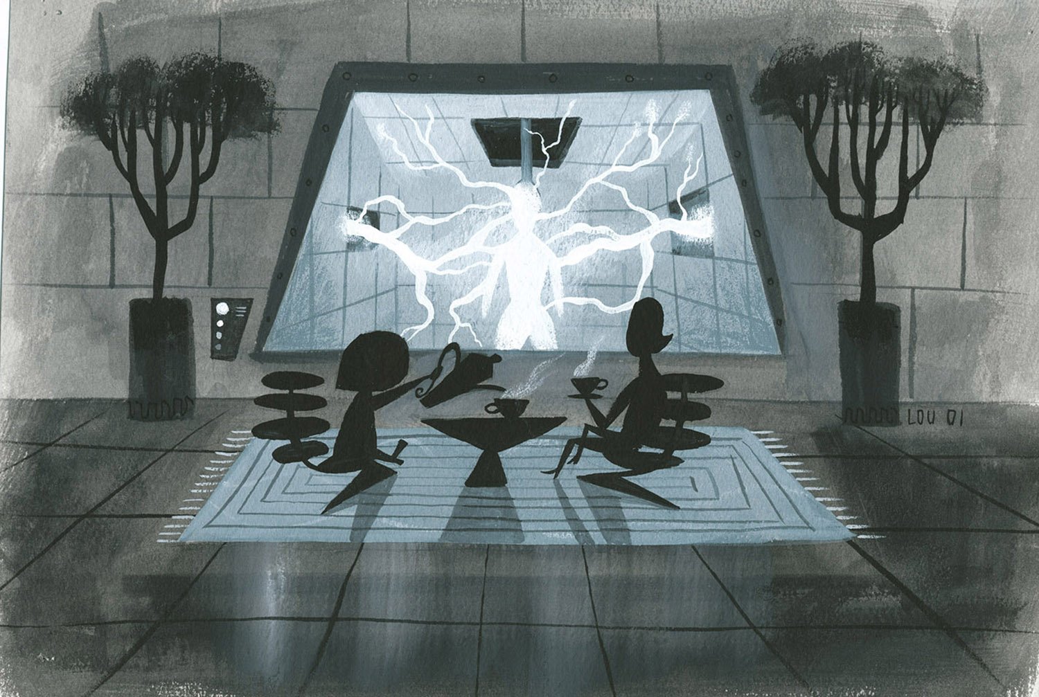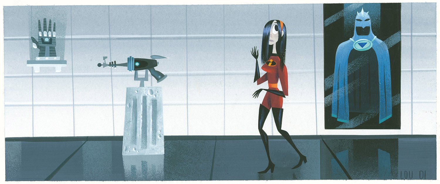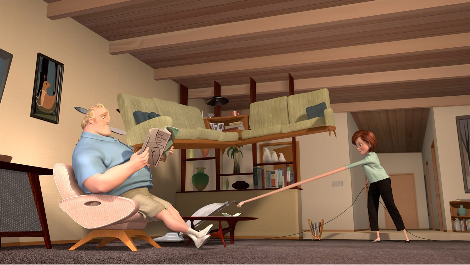 Adhering to the early 1960s theme, the Parr home is a study in mid-century architecture with some odd futuristic twists, like the washing machine with a clear plastic dome, and a TV that mashes a contemporary wide screen with a vintage console. Though the house is comfortable in most respects, the filmmakers still needed it to suggest that it was an imperfect fit for the extraordinary family. As technical director Rick Sayre puts it, “Bob is a superhero stuck in his own suburban fortress of solitude.”
