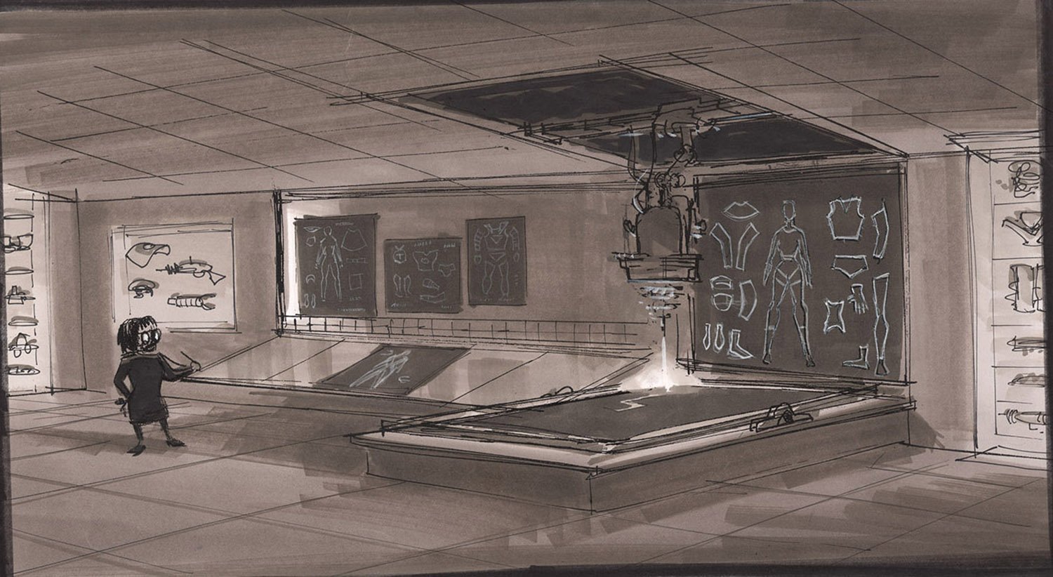 "When we started to design E’s house we knew we wanted it to be very modern and minimalist," says Production Designer Lou Romano. "But we also wanted to incorporate superhero elements as well that would tie in with E’s past work as a hero costume designer. We went to Greek mythology and art for inspiration and specifically focused on anything to do with gods and heroes – the true superheroes of that time. Featuring that ancient art seemed fitting as a comment on superheroes in the world of the film, forgotten and in decay."
